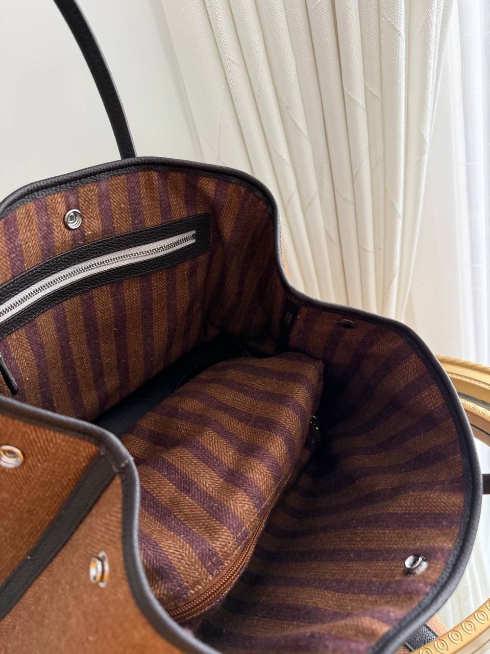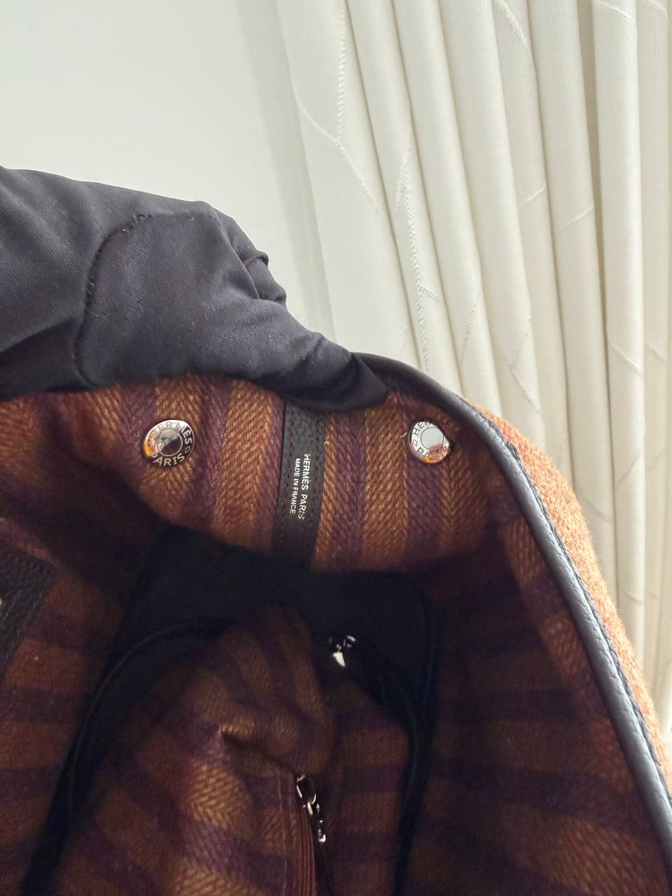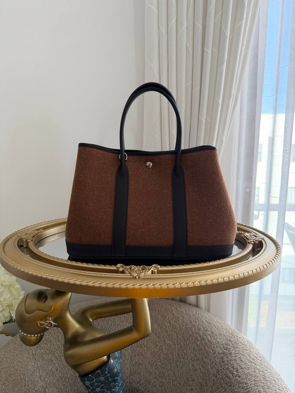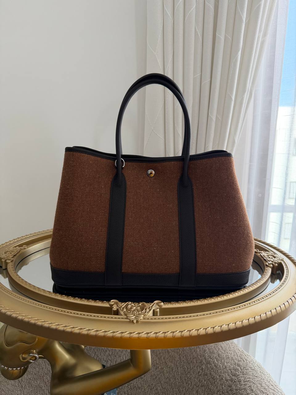 This is a Hermès Garden Party tote bag, commonly found in a brown wool tweed material with dark leather handles and trim.