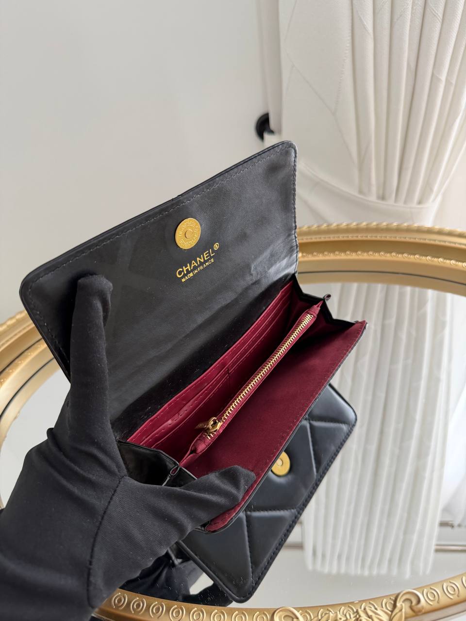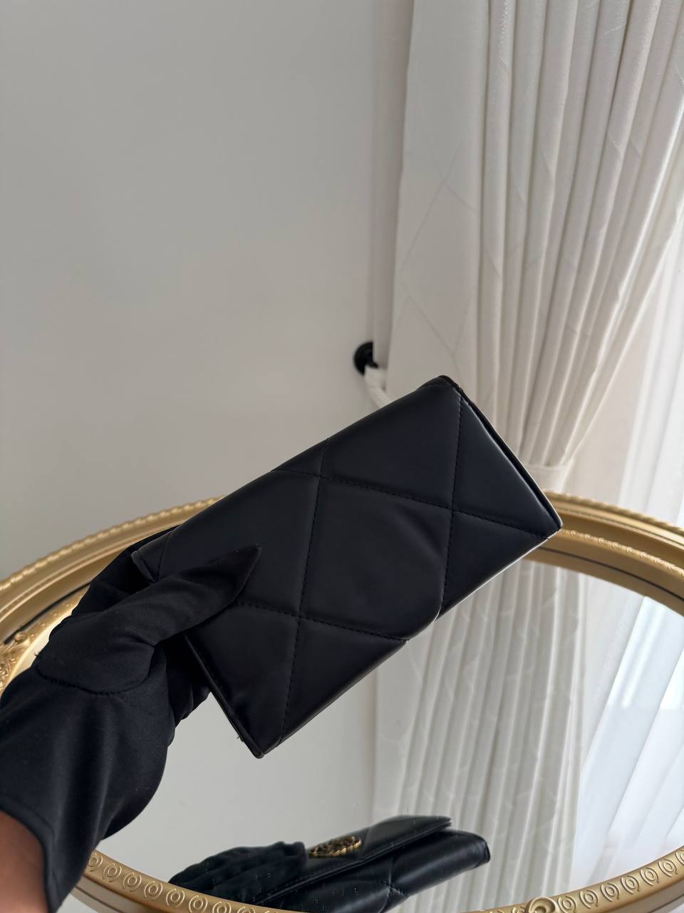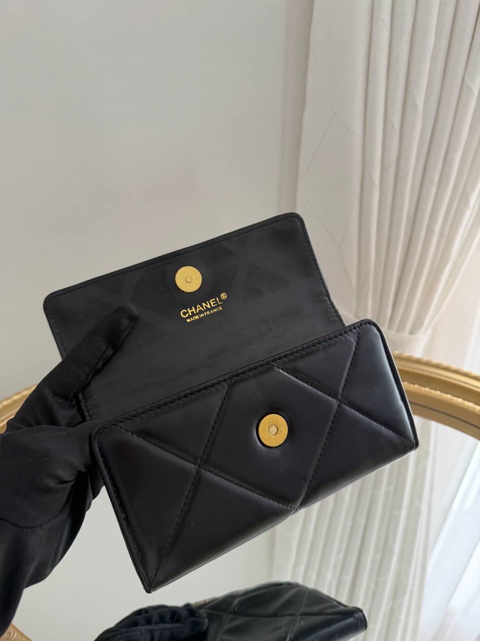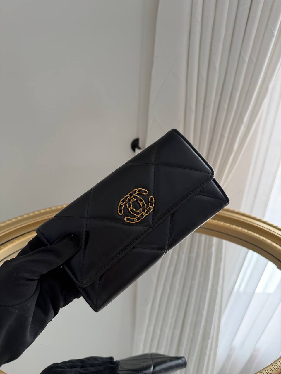 This is a black Chanel 19 flap wallet.