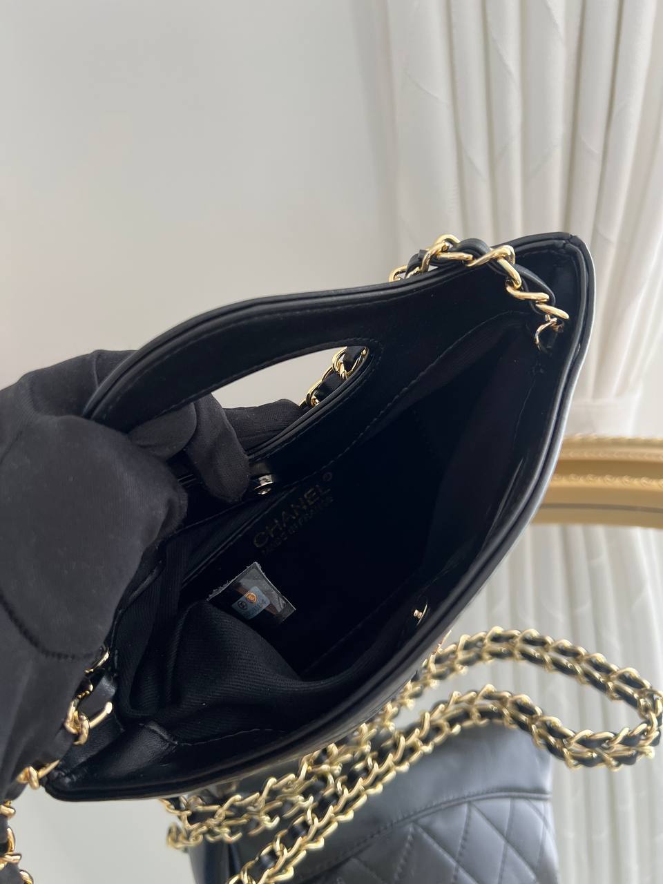 The handbag is the Chanel 31 Bag. It is a versatile piece from Chanel’s collections that features the brand’s iconic diamond-quilted leather and a unique design with cut-out top handles.
