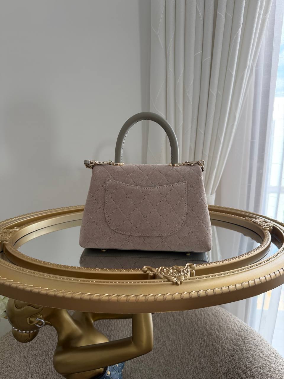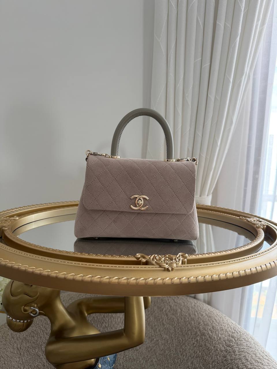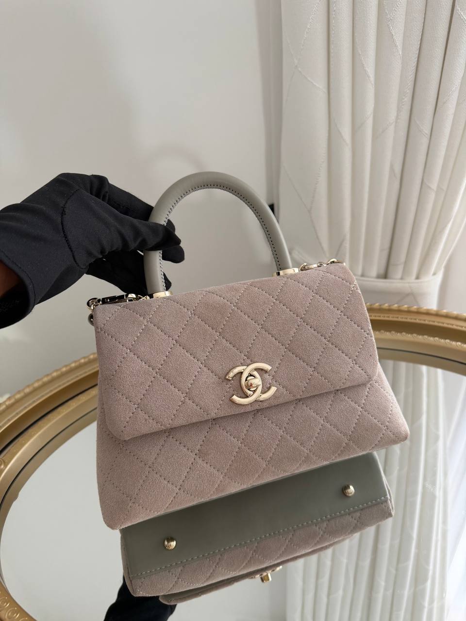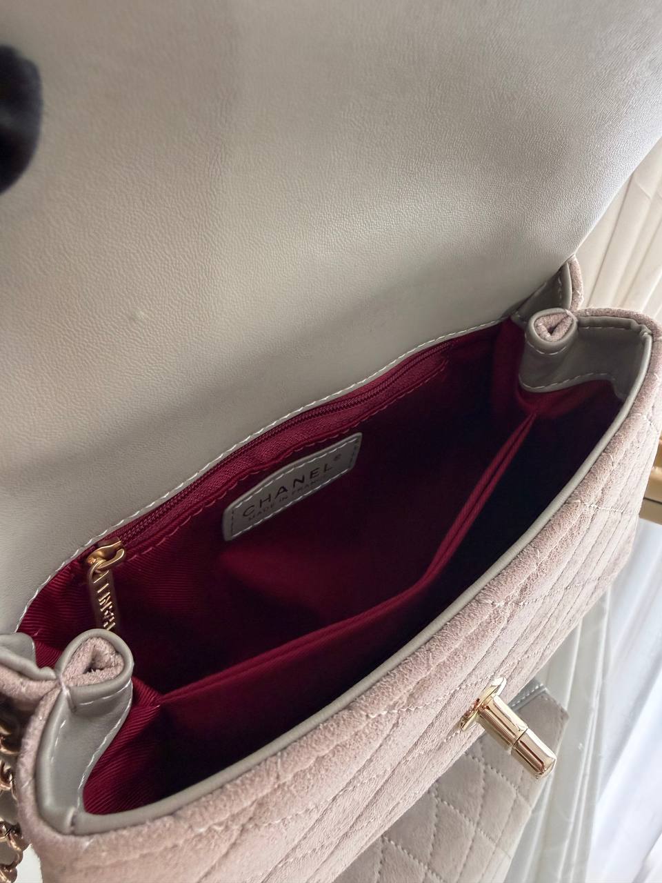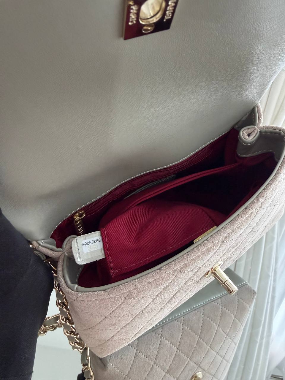The pictured item is a Chanel Flap Bag in a dark beige suede calfskin.