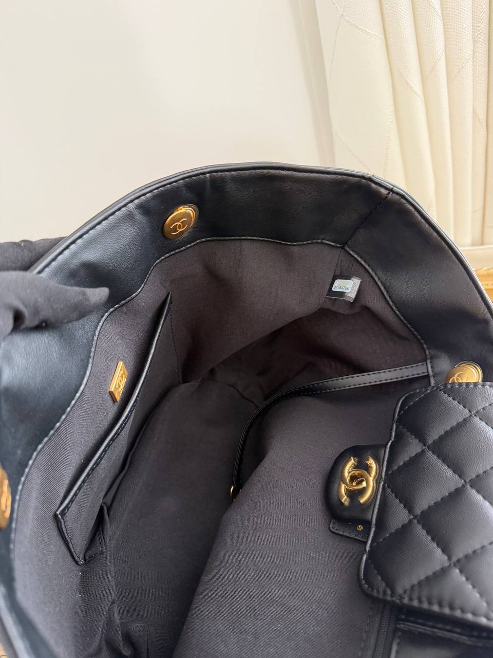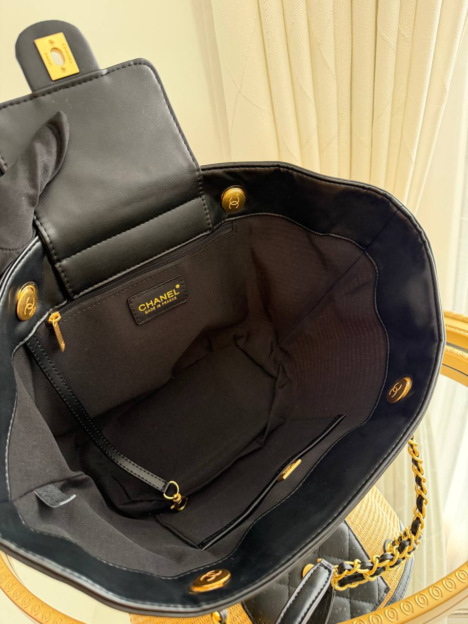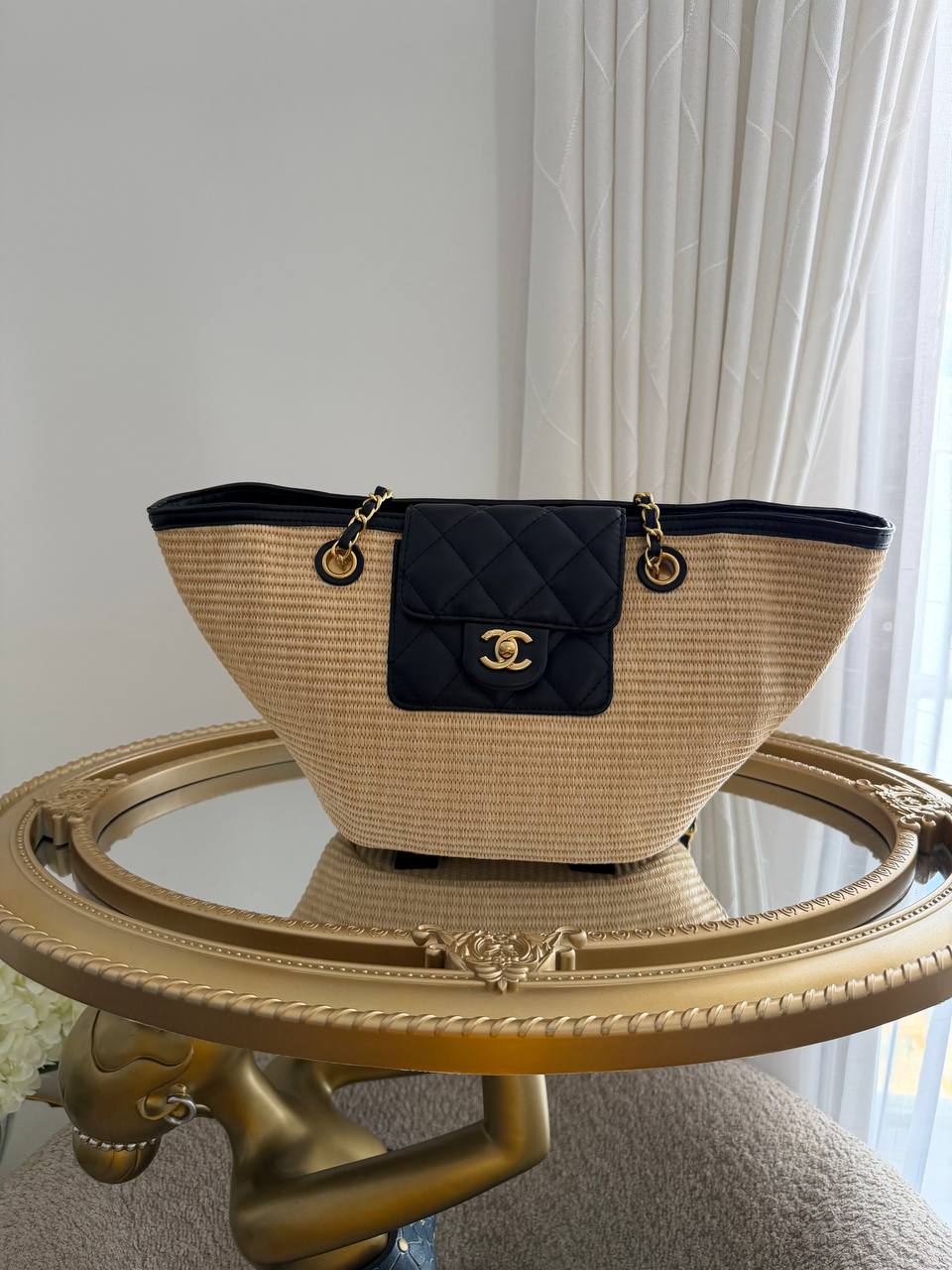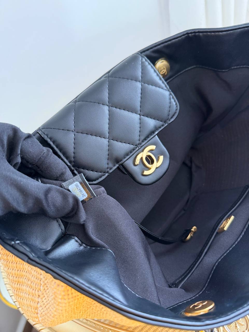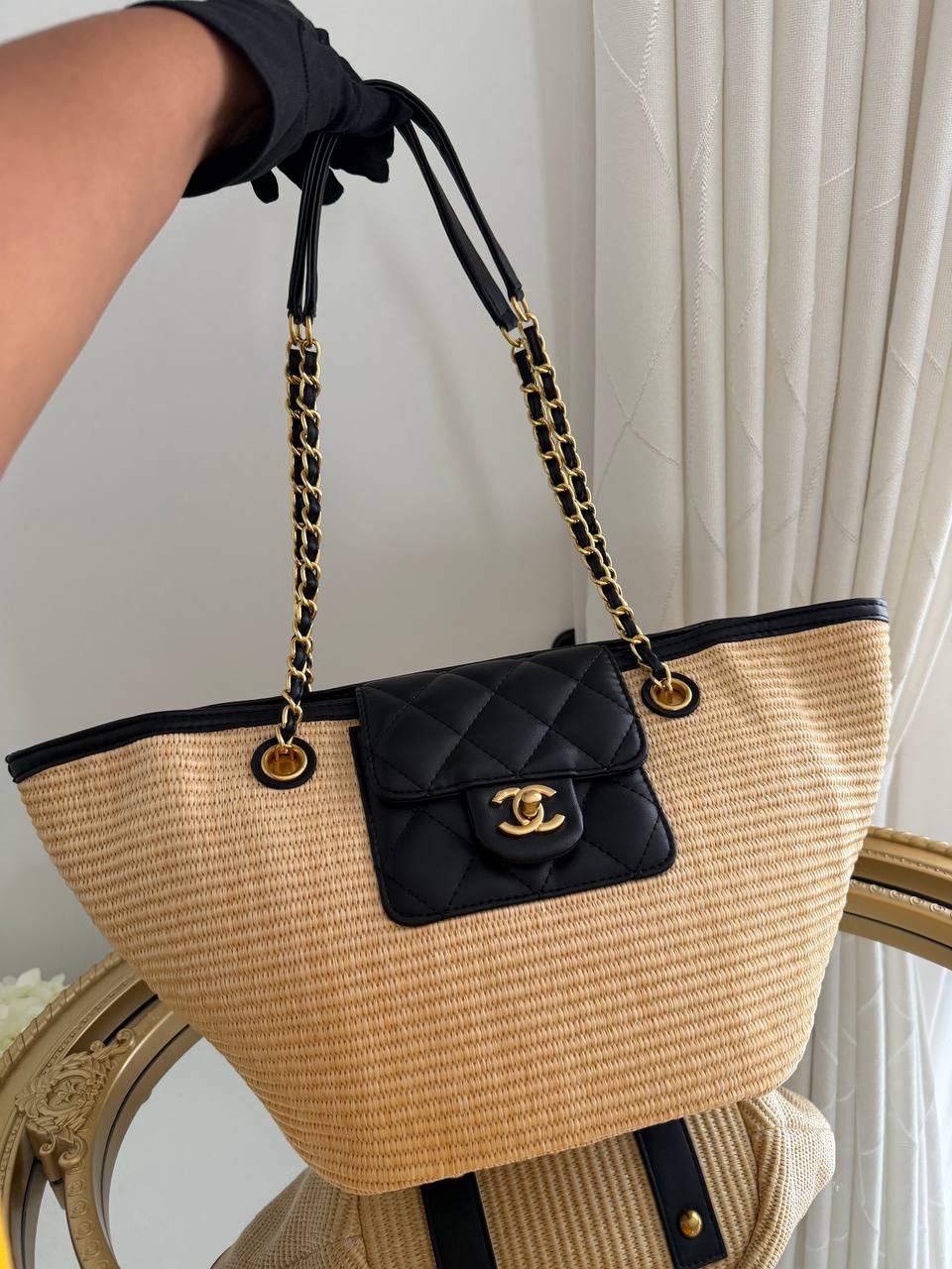 This item is a Chanel woven raffia tote bag featuring a black quilted leather pocket with a gold-tone CC logo.