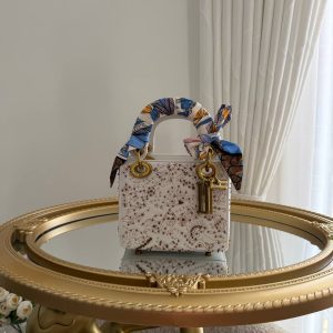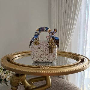 This is a Dior Book Tote from the Spring-Summer 2026 collection, featuring blue Dior Oblique embroidery with a white lace frame and a Médaillon signature.