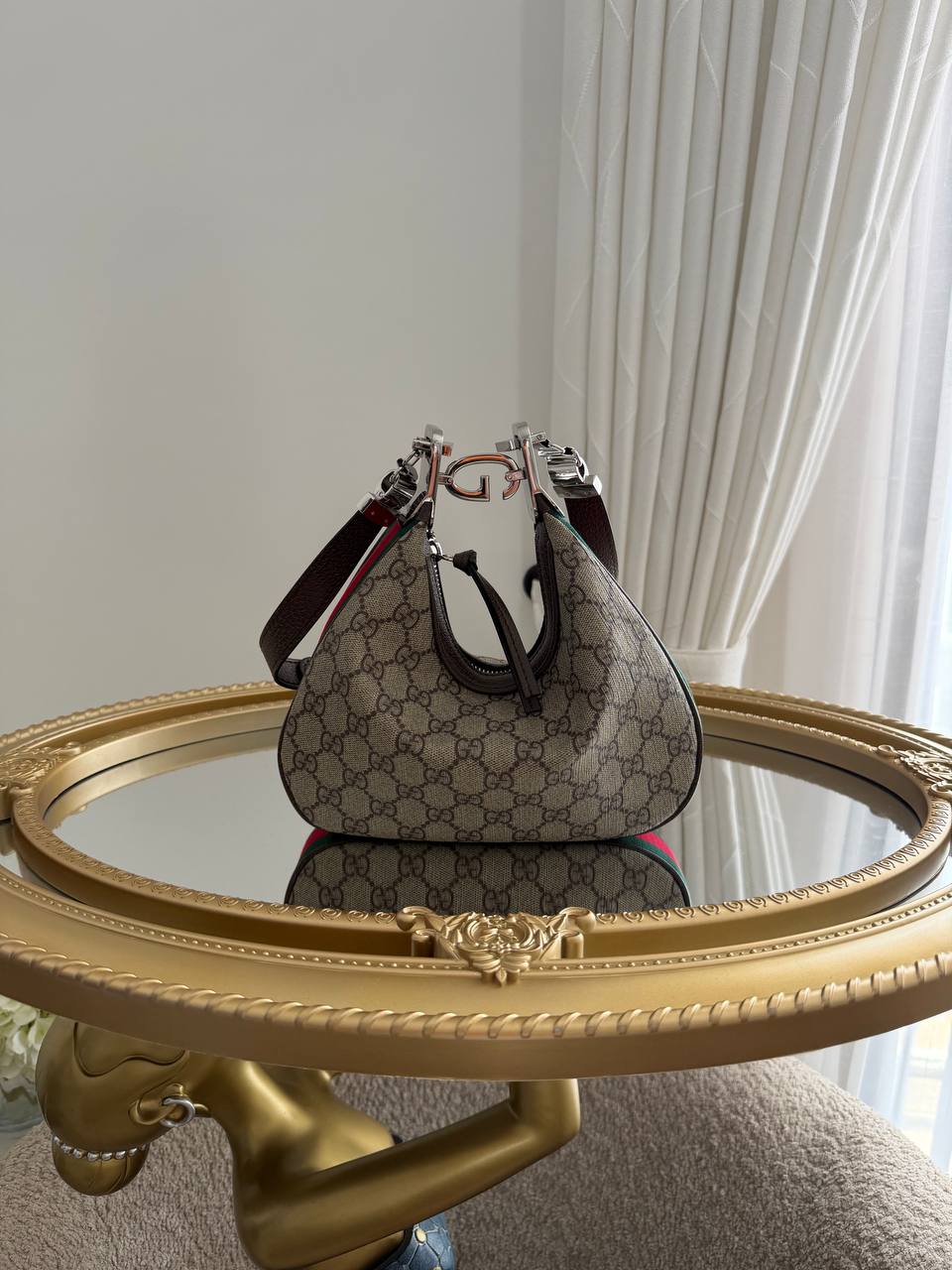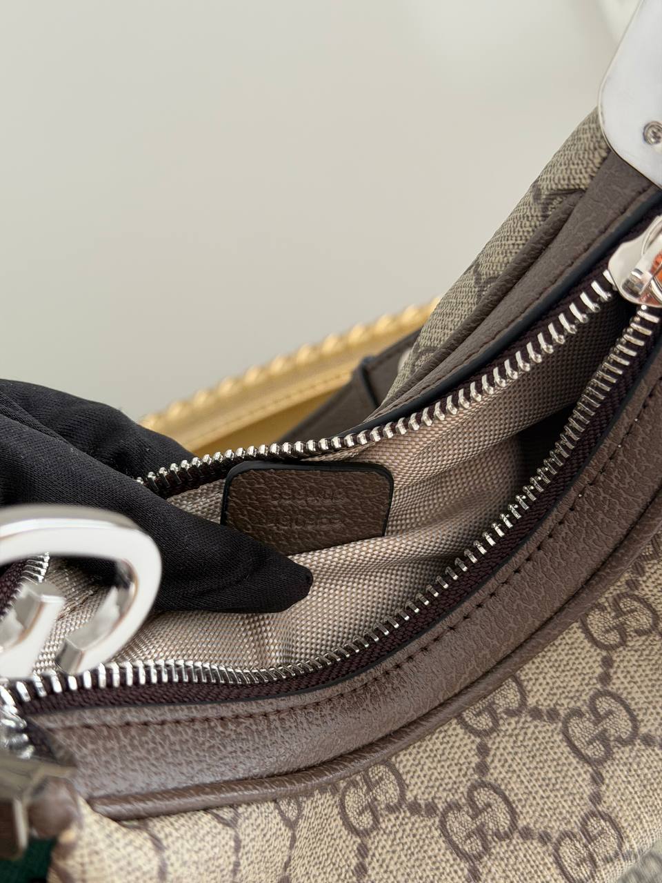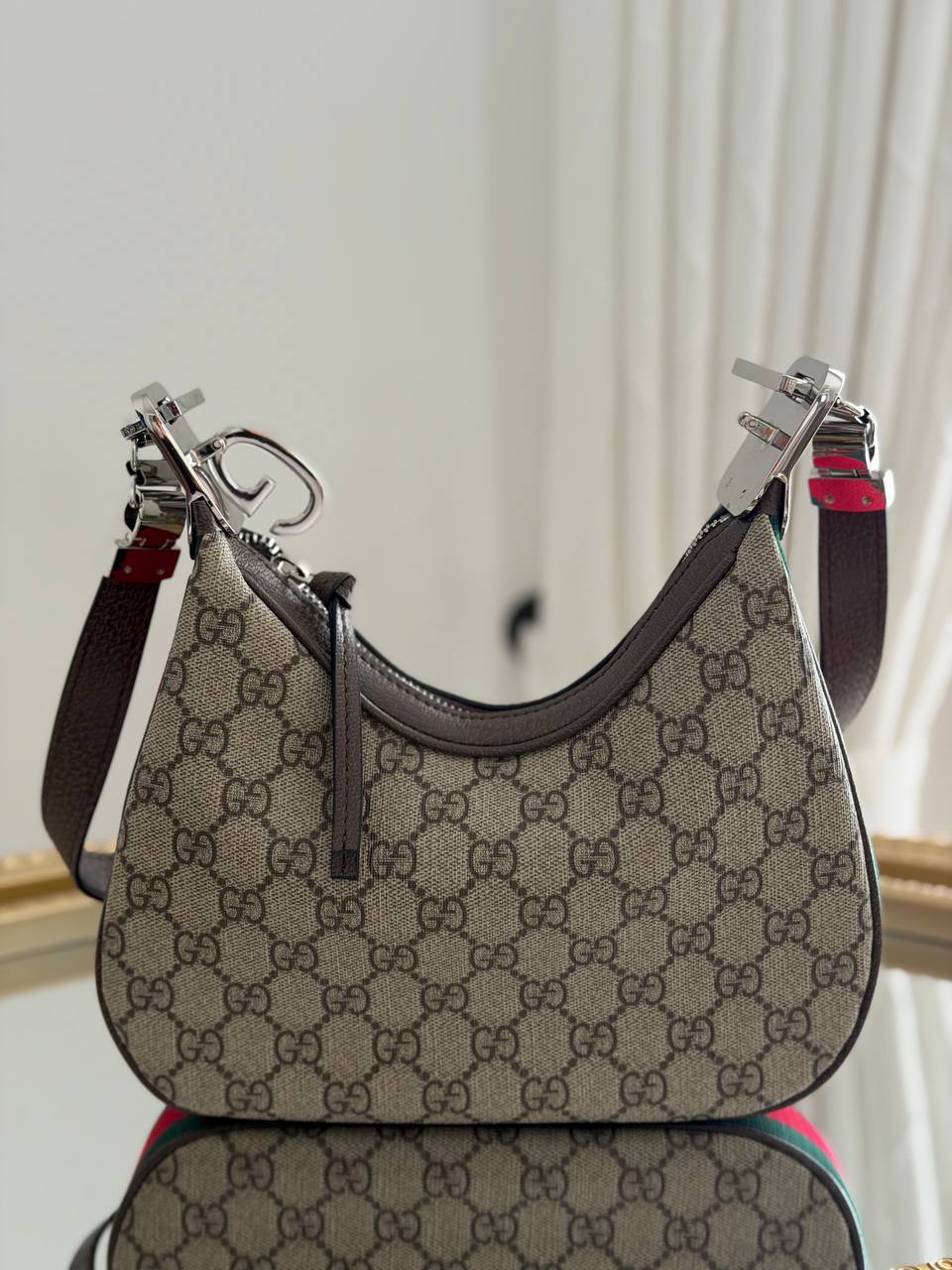 The product in the image is a Gucci Attache Small Shoulder Bag crafted from GG Supreme canvas with a G-shaped hook closure.