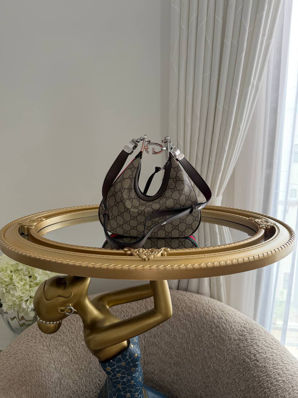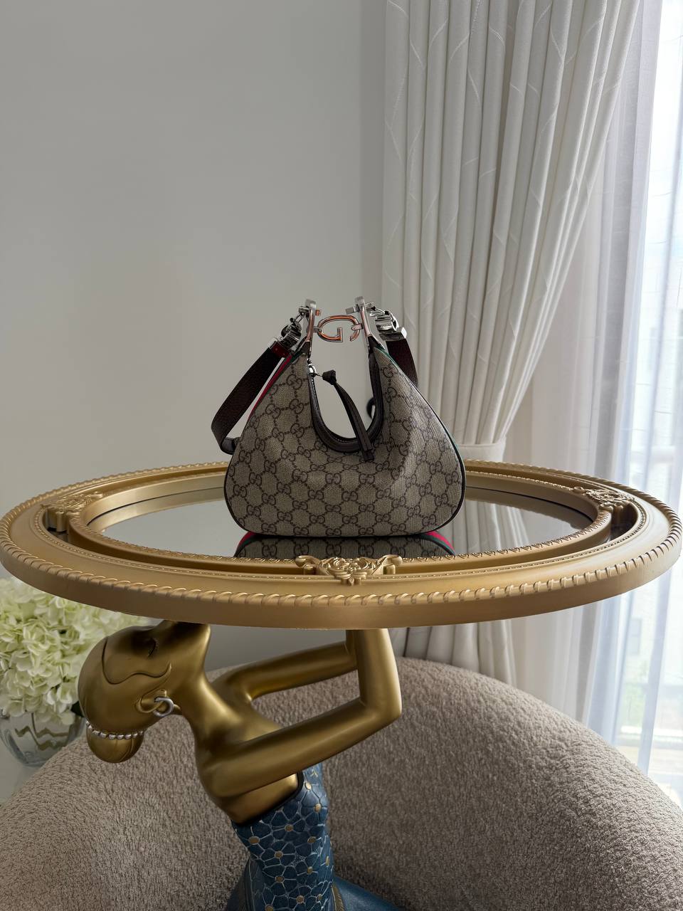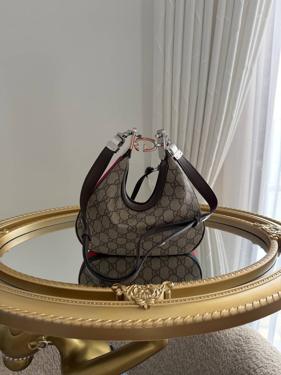 The product in the image is a Gucci Attache Small Shoulder Bag crafted from GG Supreme canvas with a G-shaped hook closure.