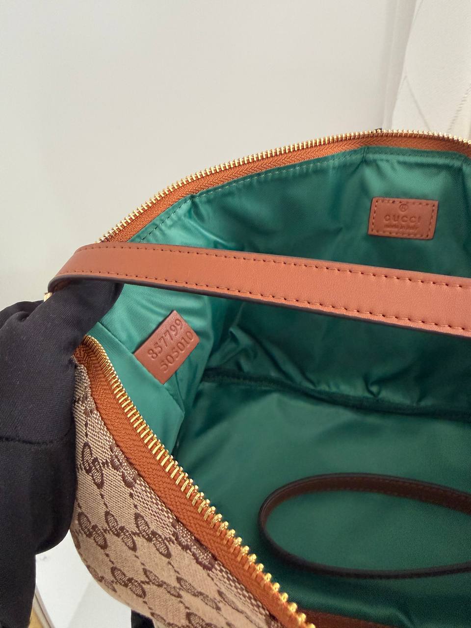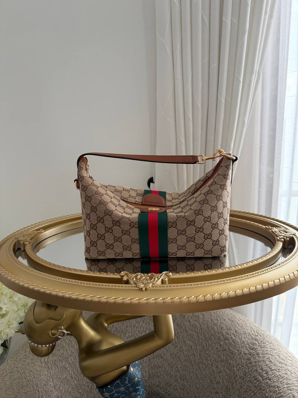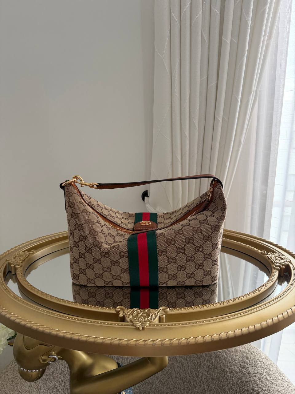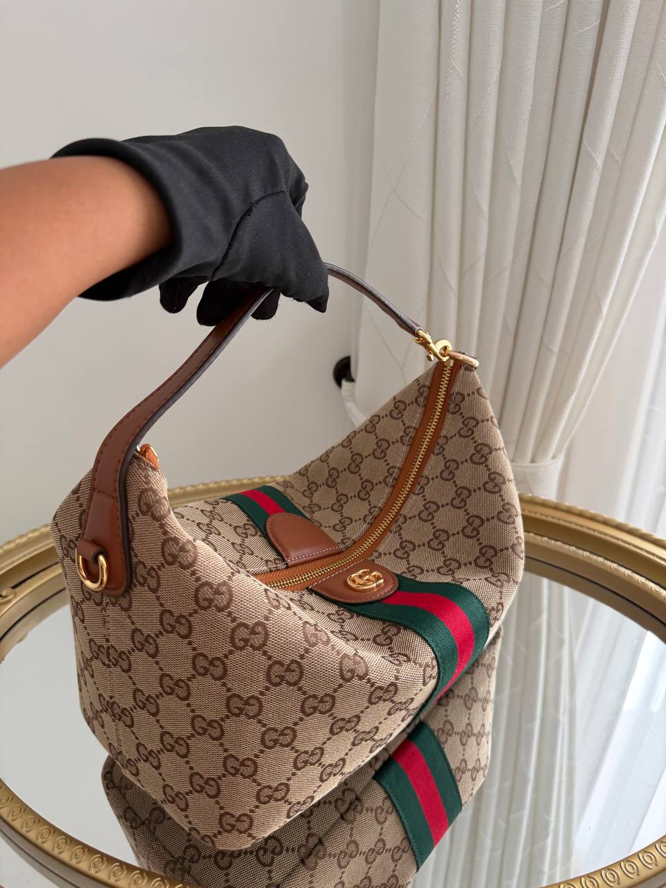 The product is a Gucci Vanity Medium Top Handle Bag featuring the brand’s recognizable web stripe and GG canvas.