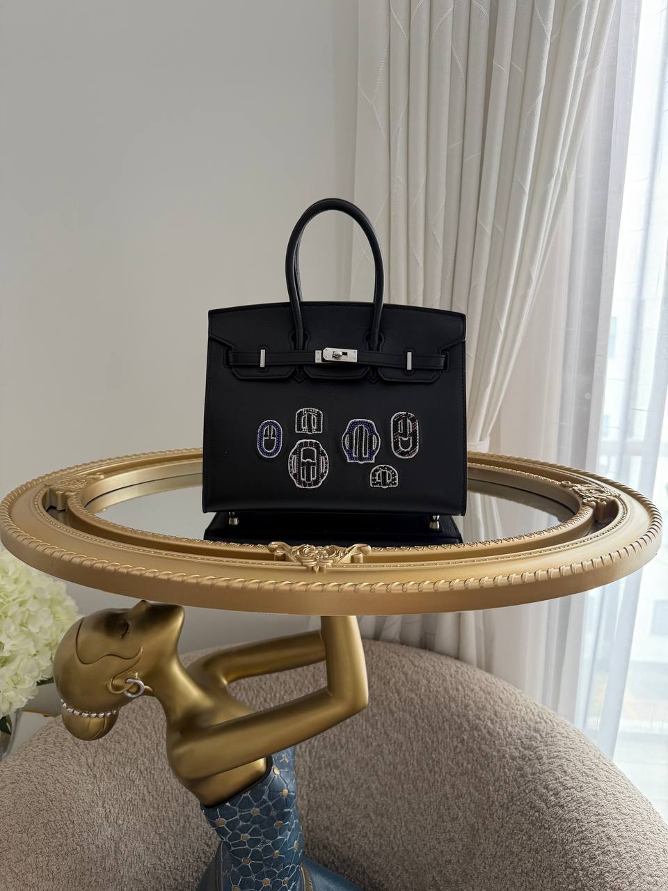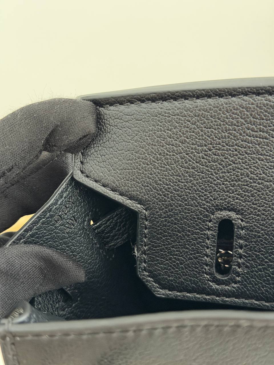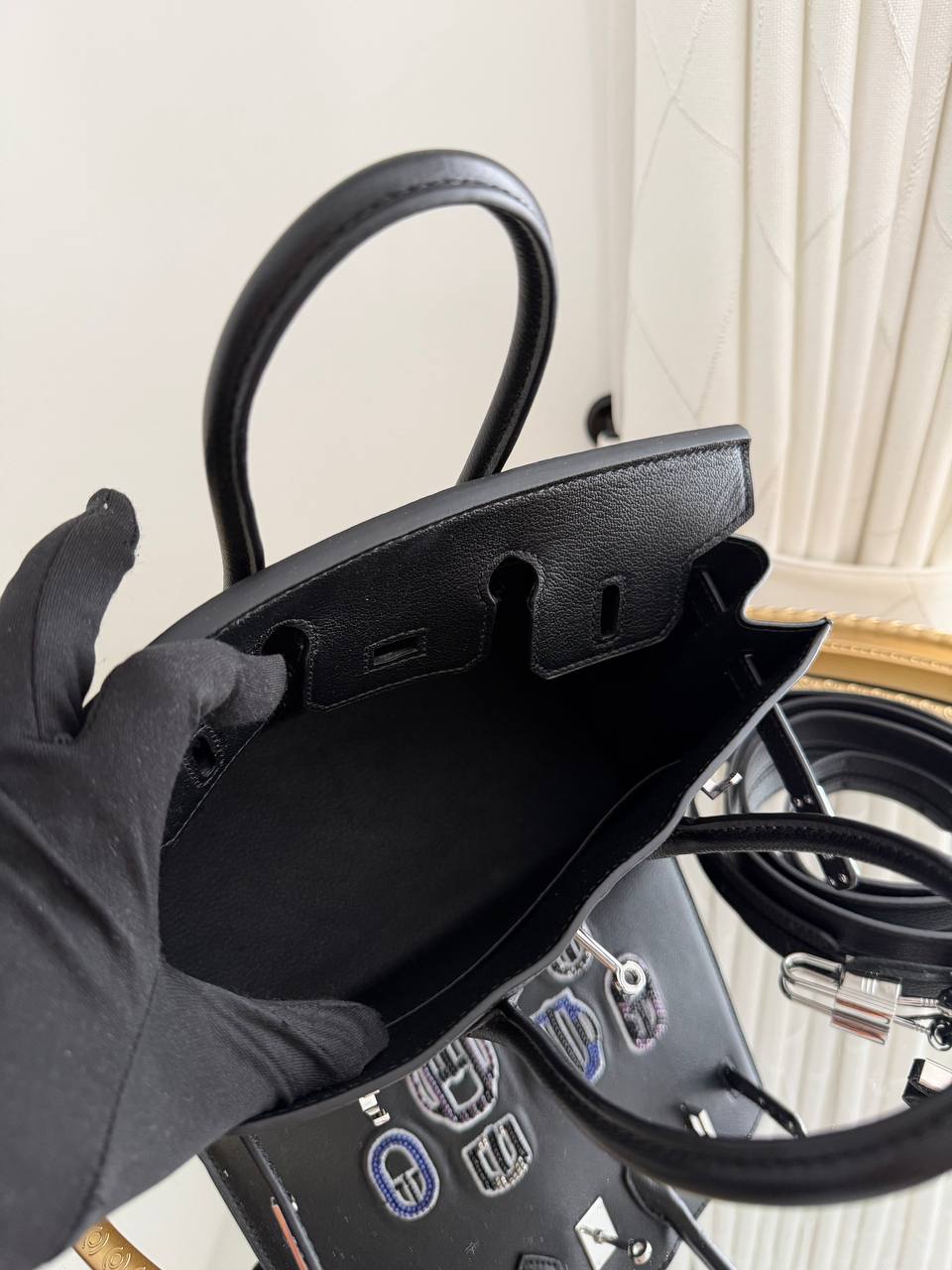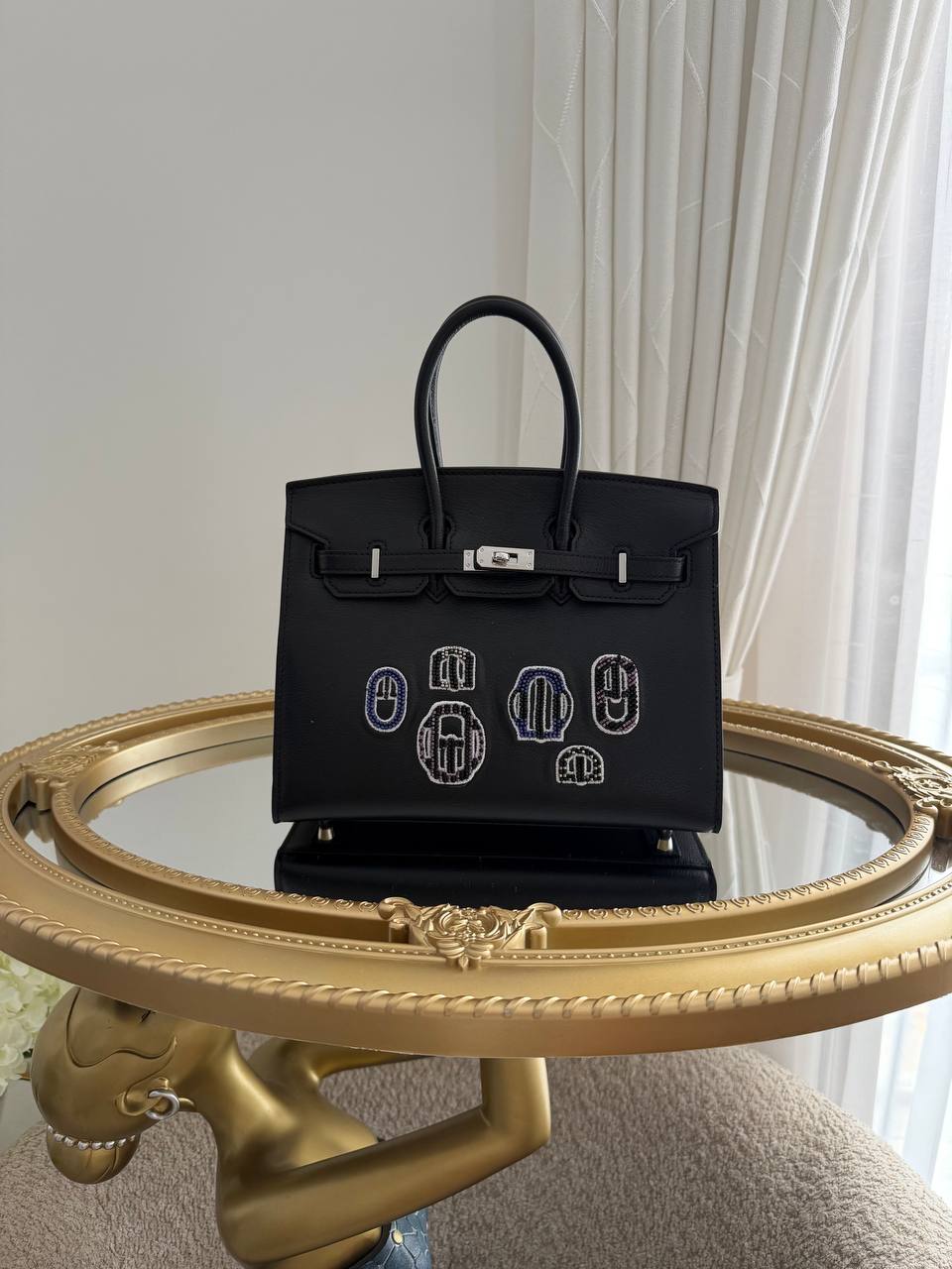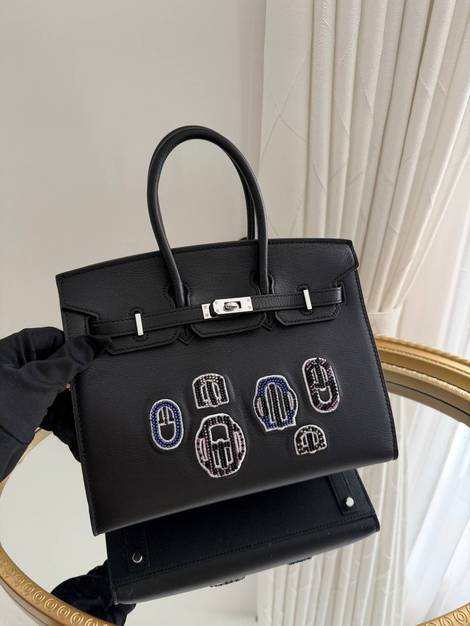 This is a Hermès Birkin 20 bag from the Bouclerie Moderne Casaque series, featuring black leather and palladium hardware.