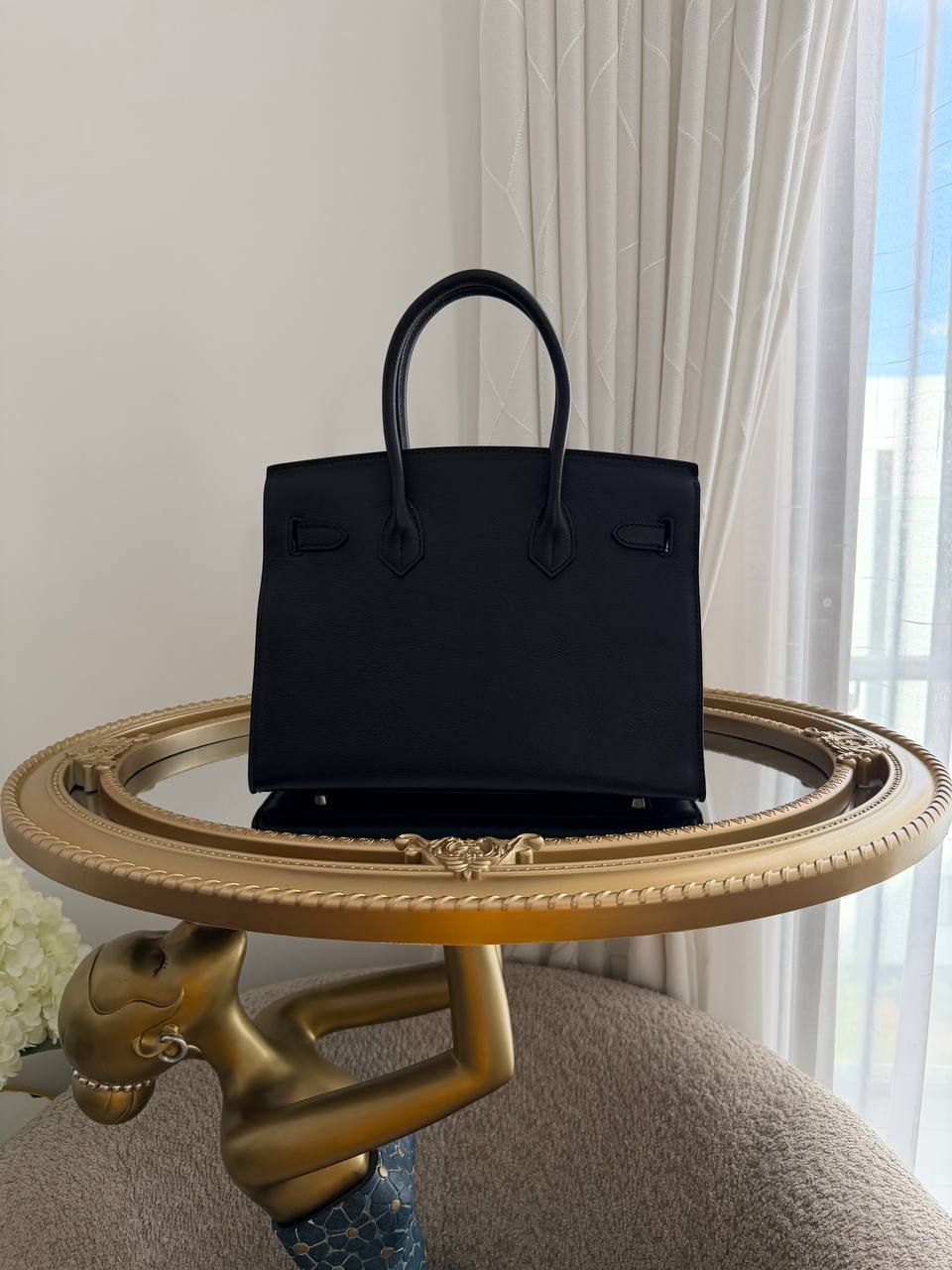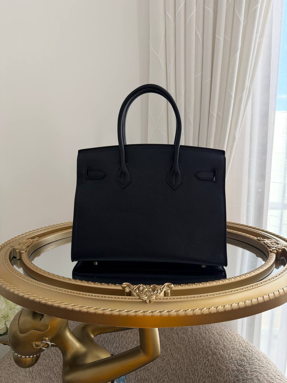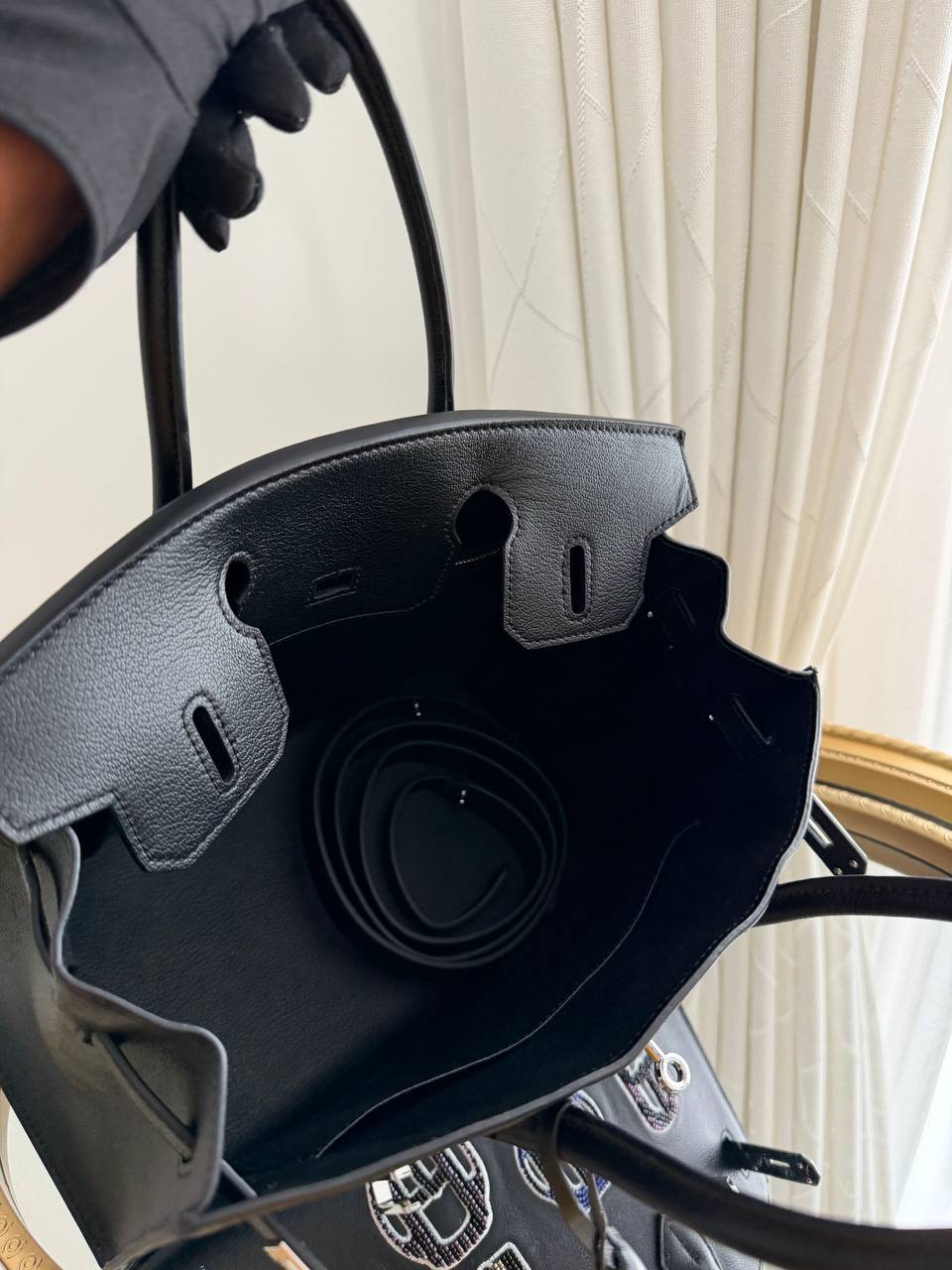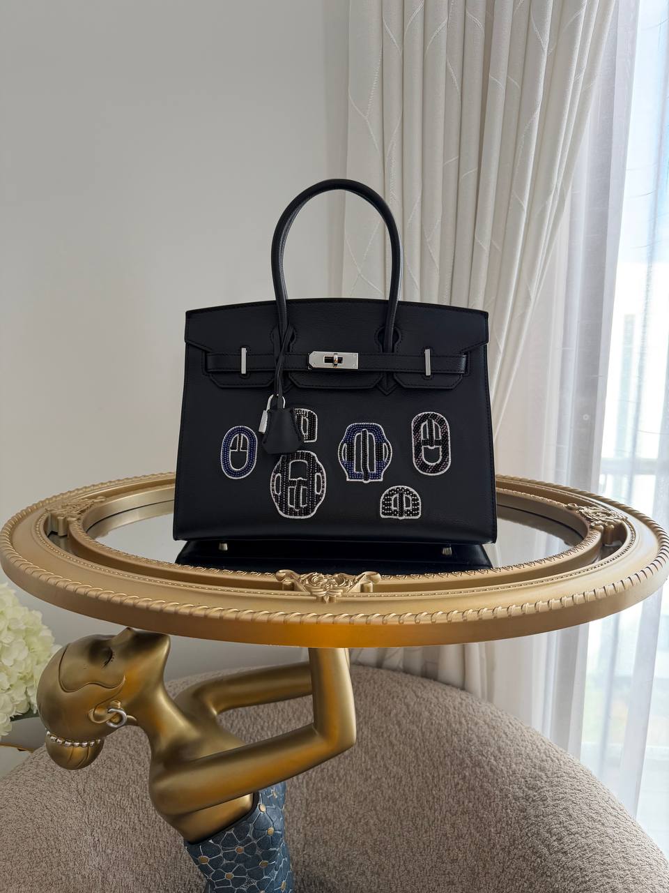 This image features a limited edition Hermès Birkin 20 Sellier Bouclerie Moderne bag in Black Chèvre leather with polished palladium hardware.