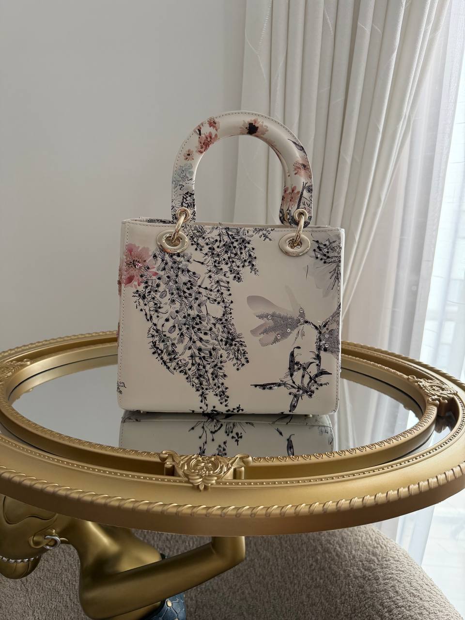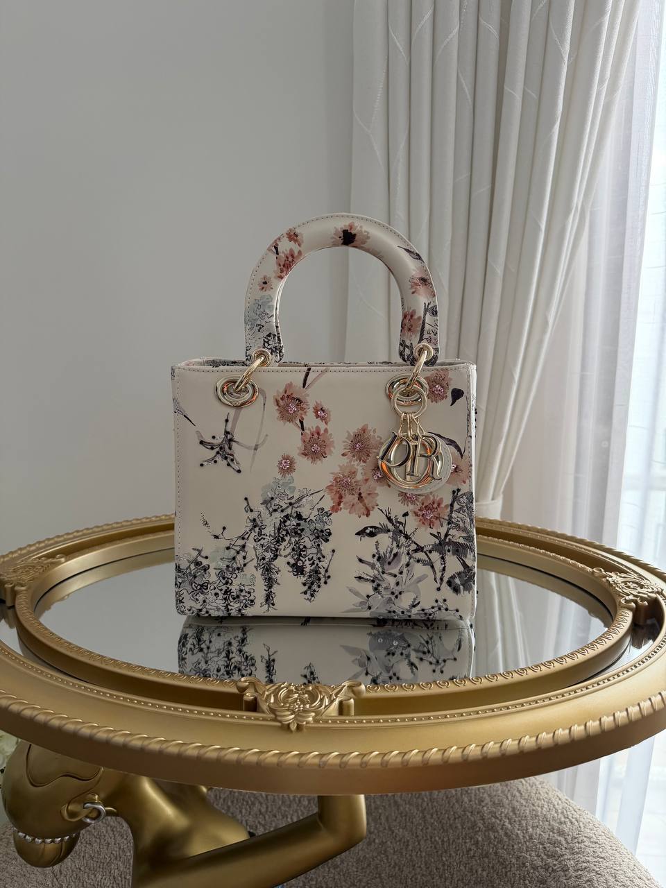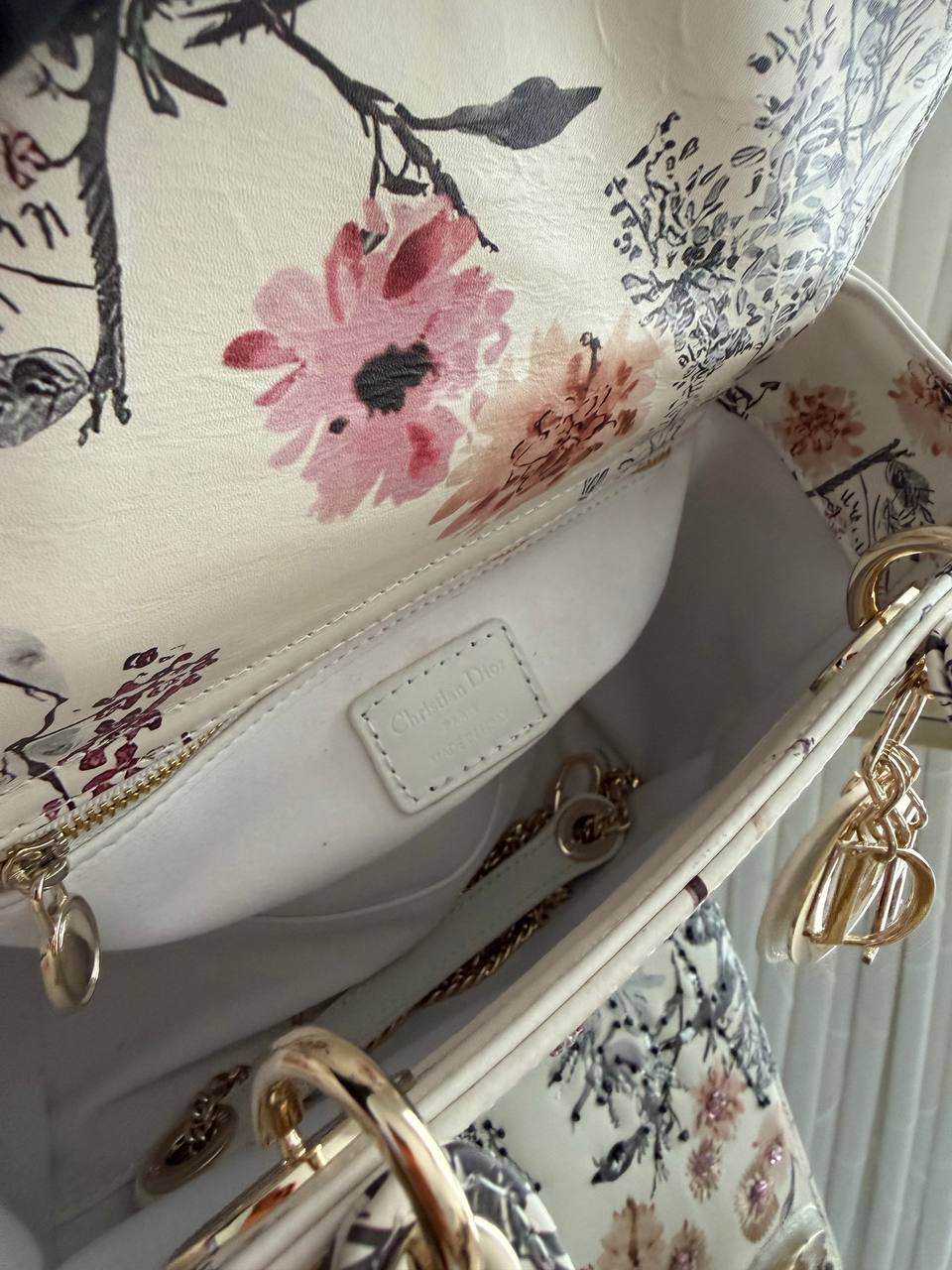 This item is a Christian Dior Small Lady Dior My ABCDior Bag, featuring a floral print overlay on a white background and light gold-tone hardware.