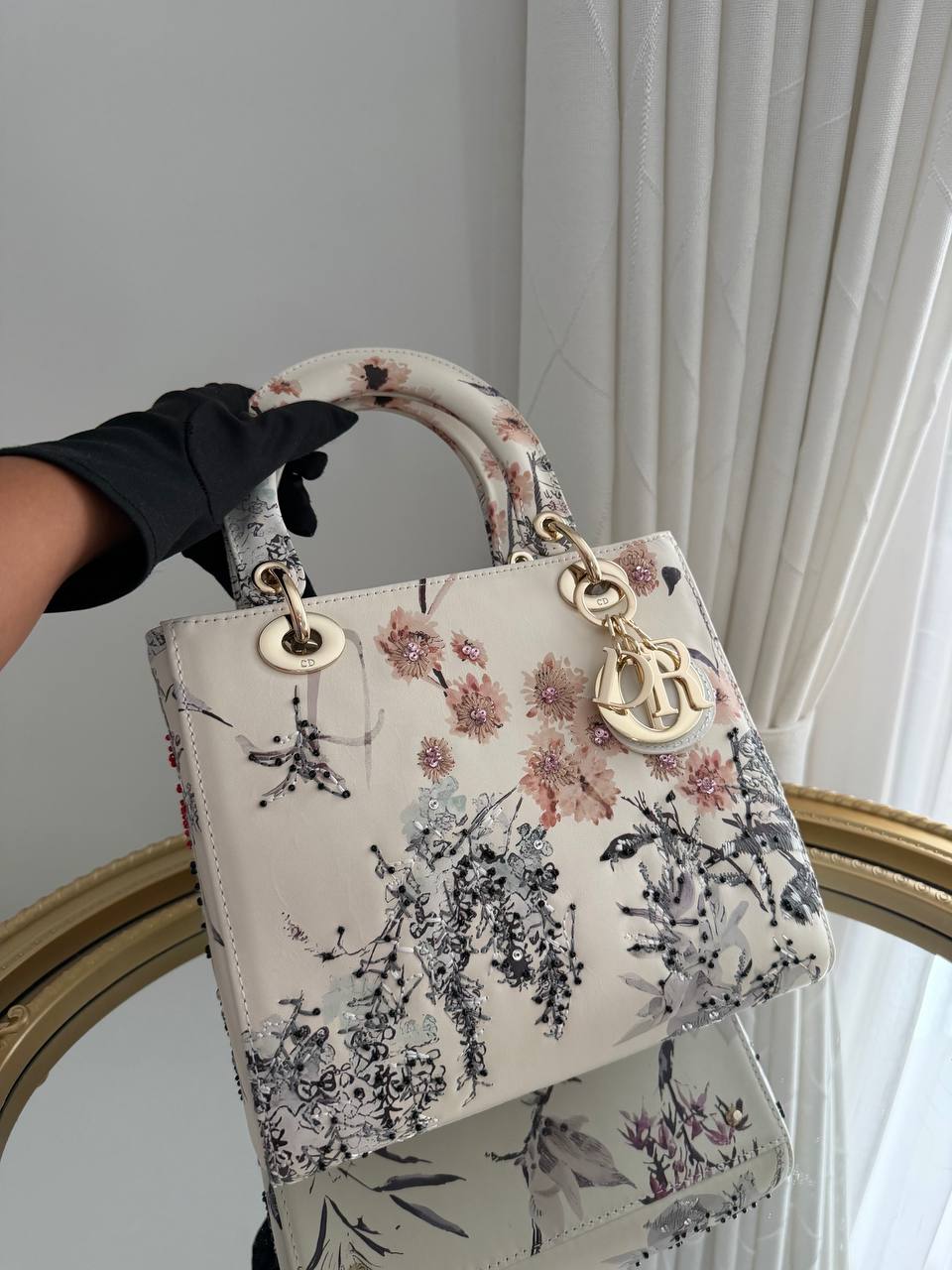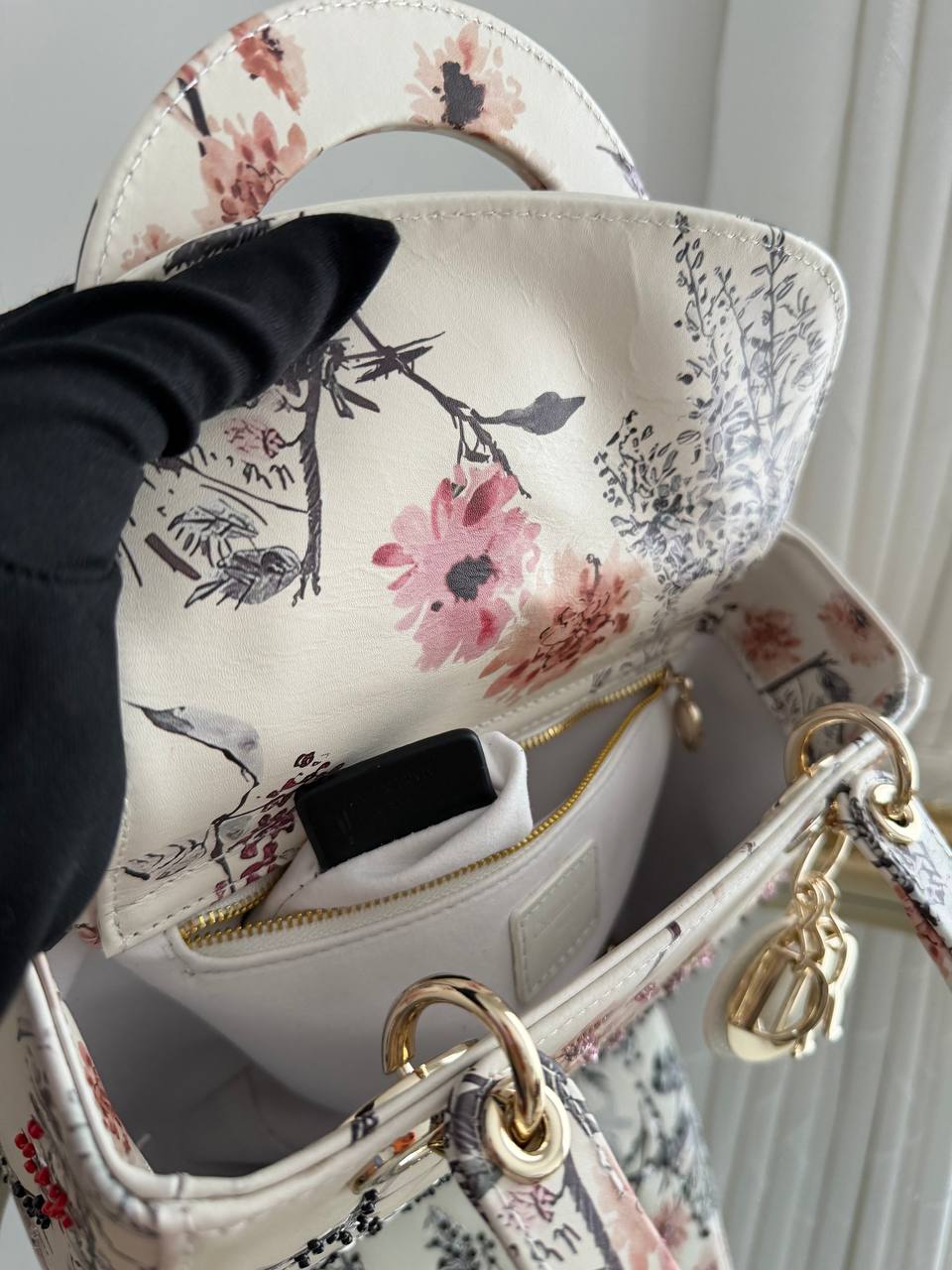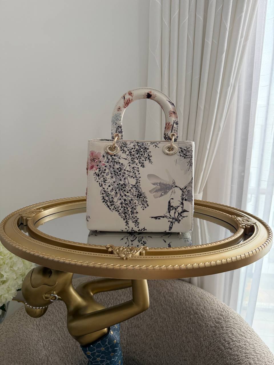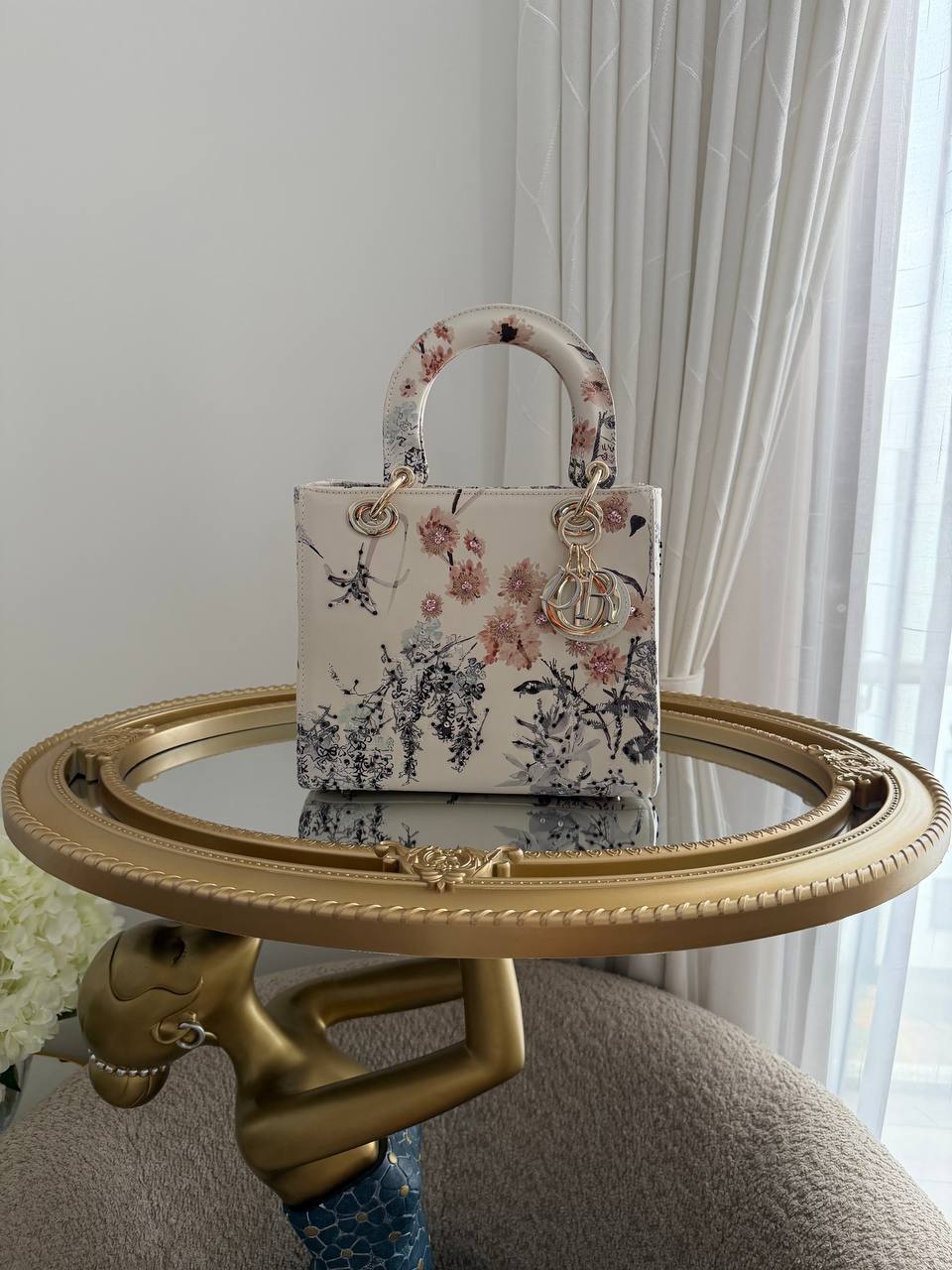This item is a Christian Dior Small Lady Dior My ABCDior Bag, featuring a floral print overlay on a white background and light gold-tone hardware.