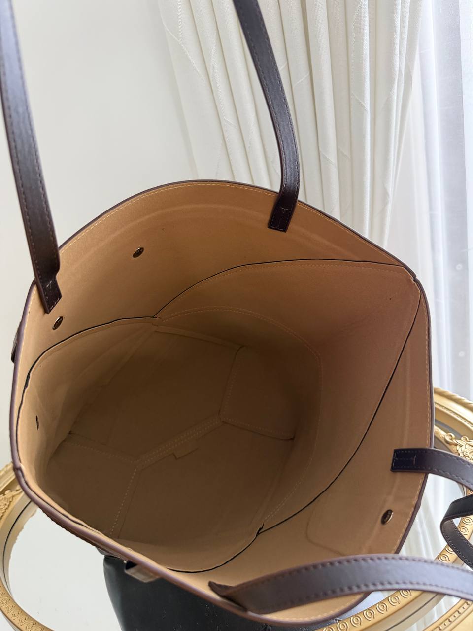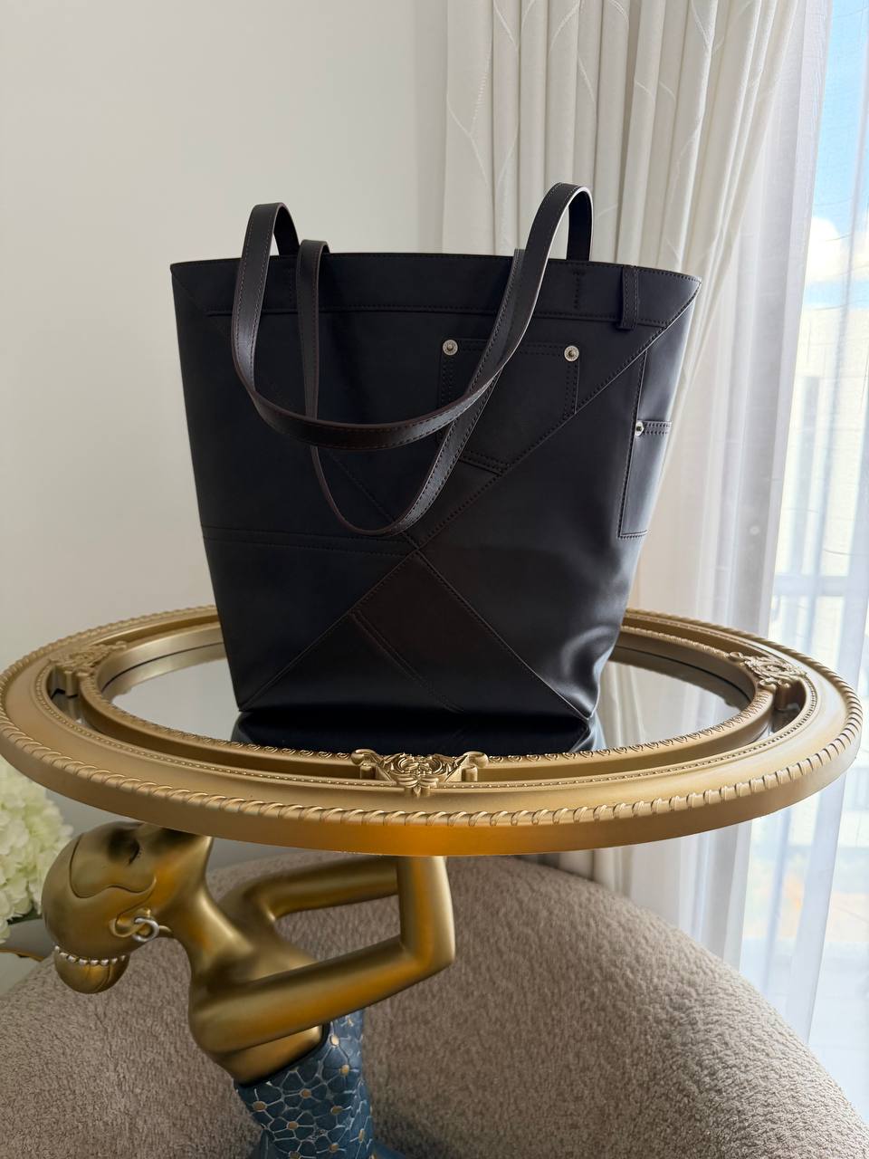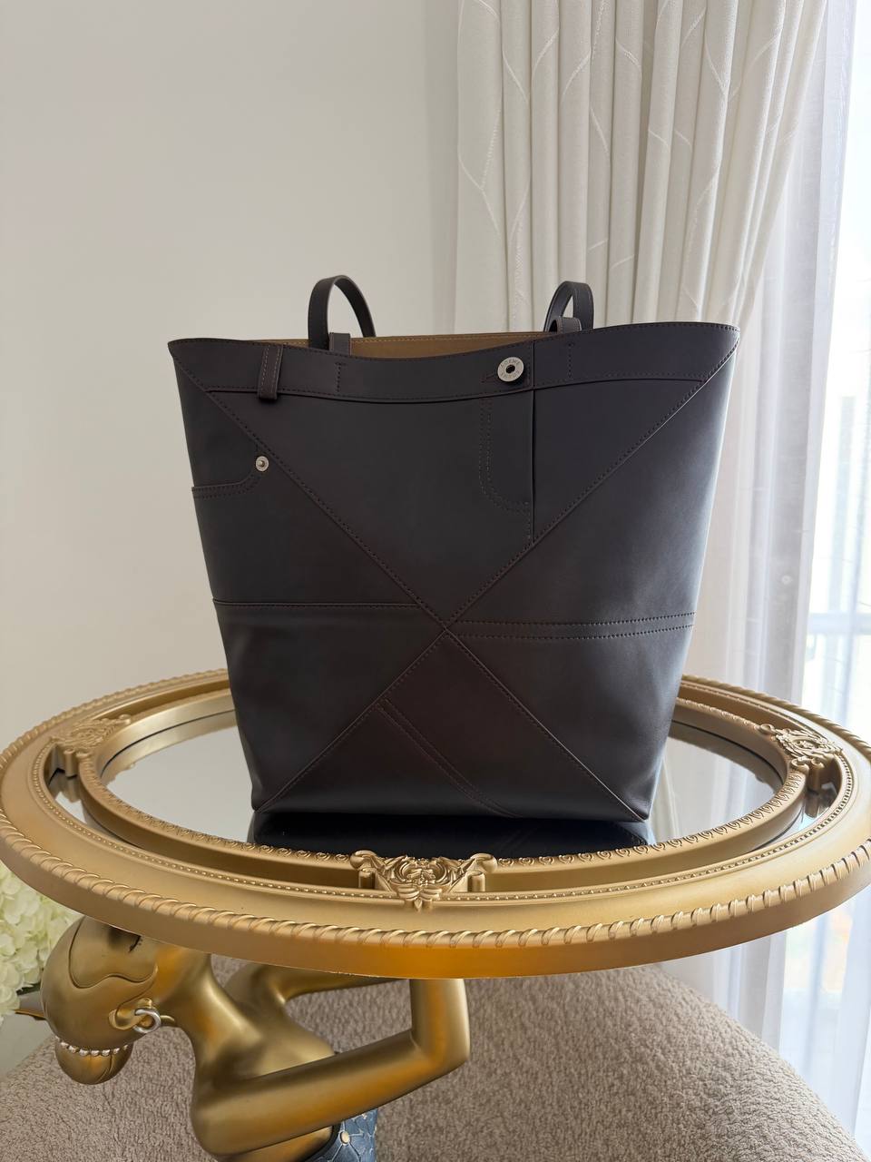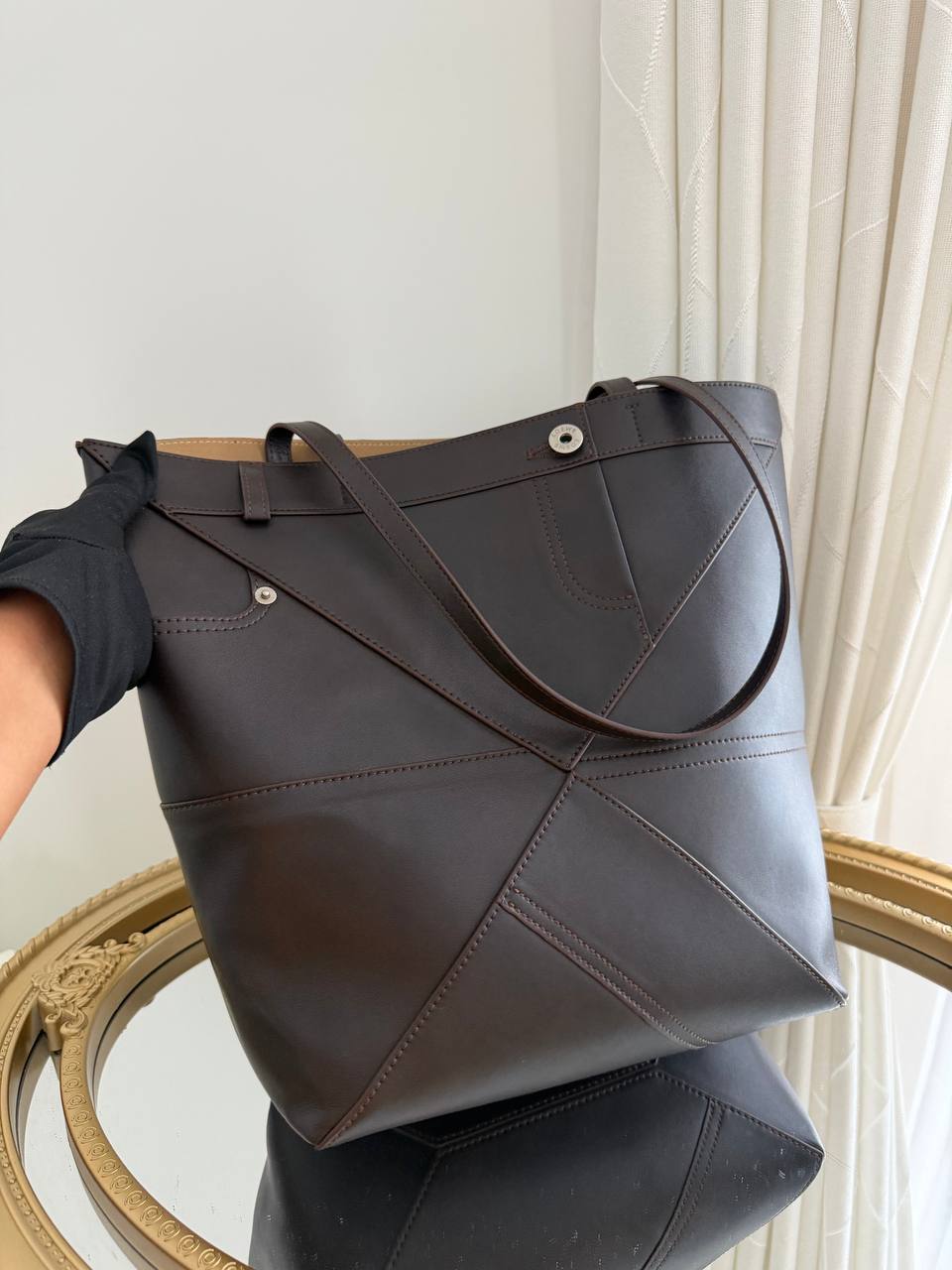The product is a Loewe Puzzle Fold tote bag, specifically identified as a model featuring design elements inspired by a five-pocket jean waistband.