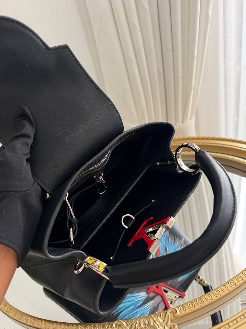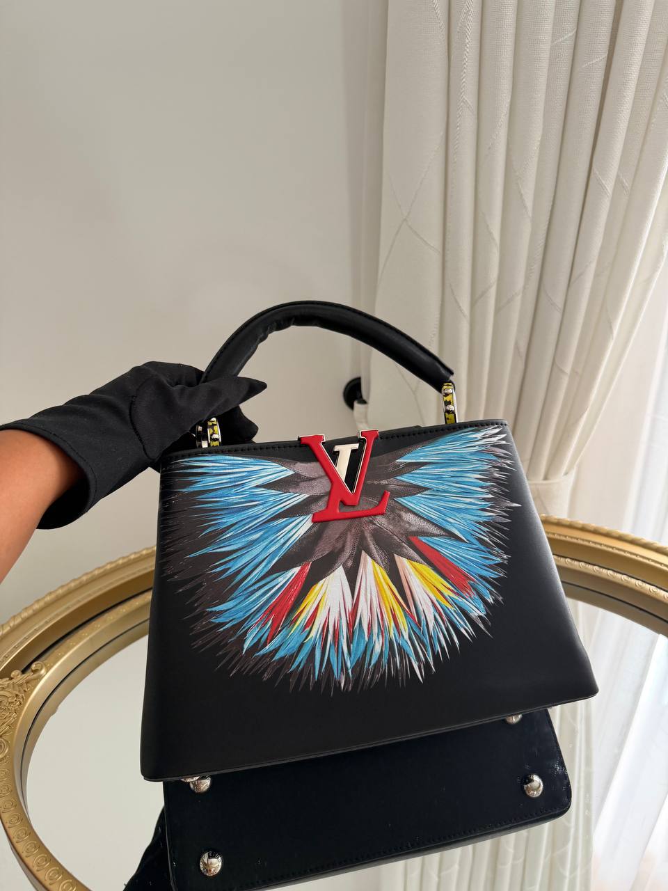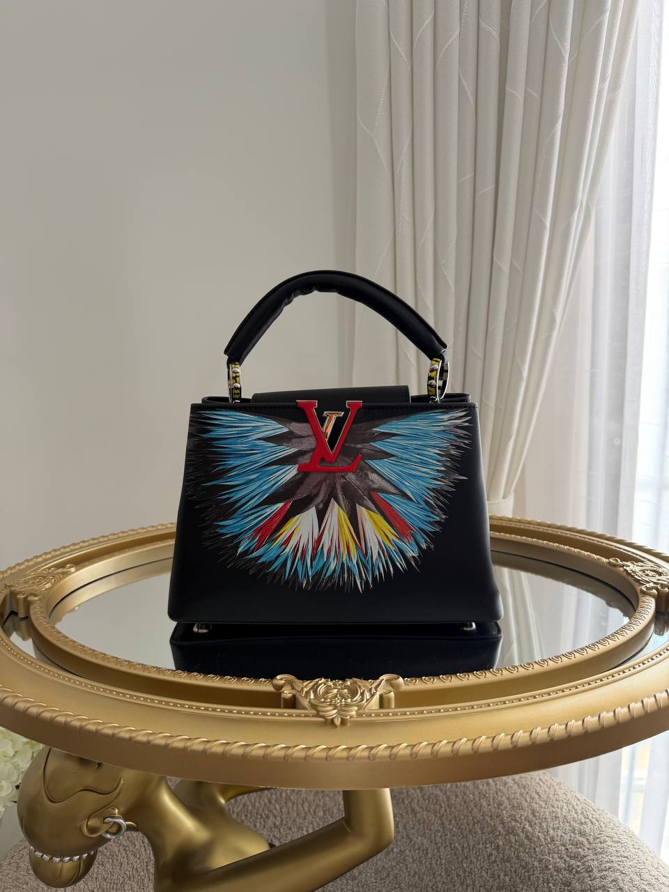 This is a Louis Vuitton Capucines Mini handbag featuring a decorative feather embellishment.