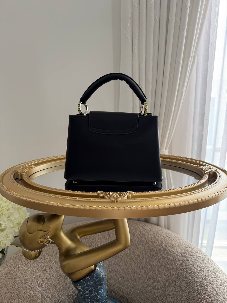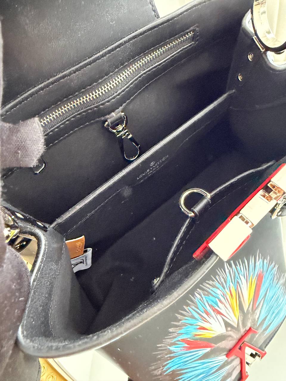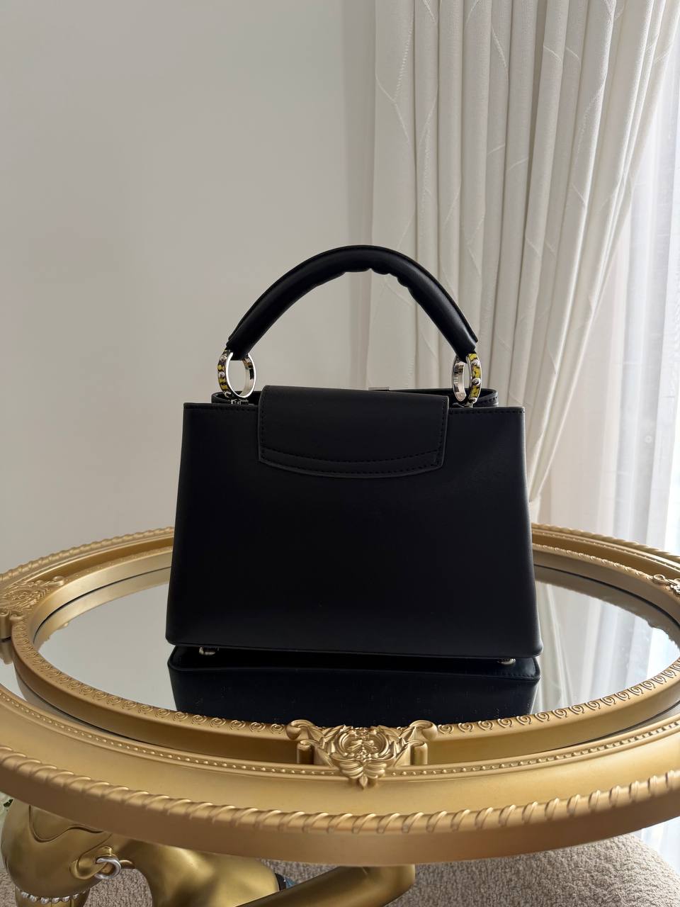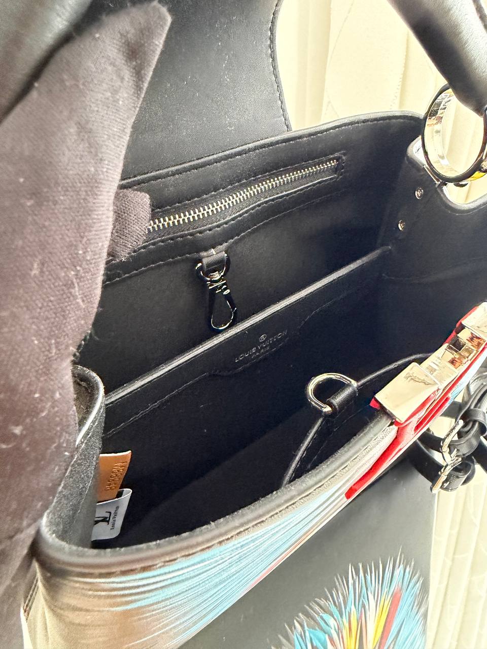 This is a Louis Vuitton Capucines Mini handbag featuring a decorative feather embellishment.