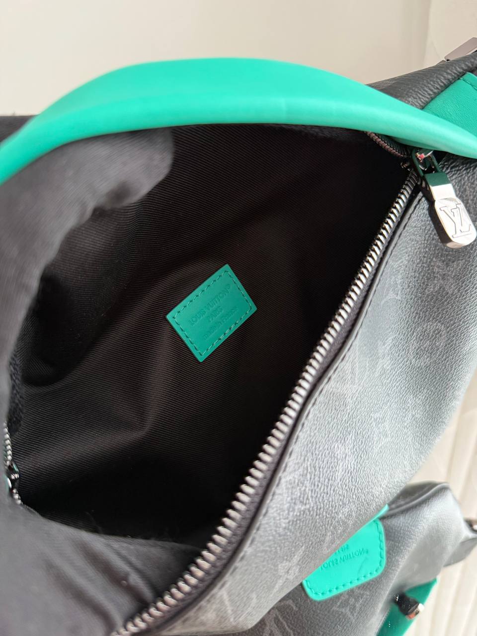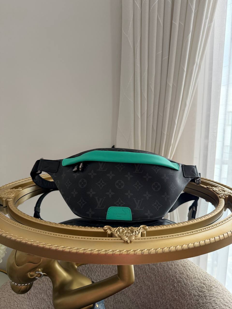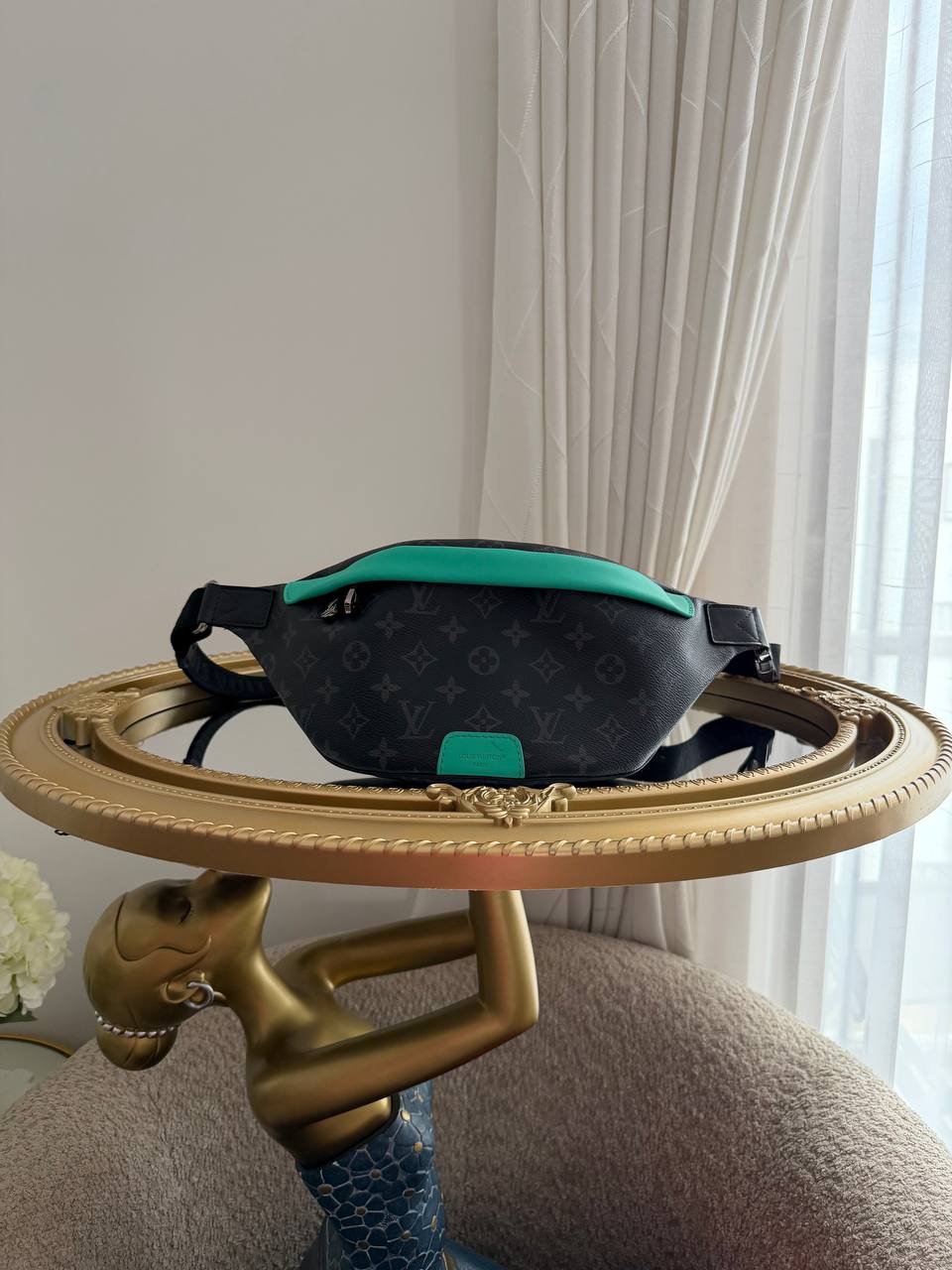 This is a Louis Vuitton Discovery Bumbag PM in Monogram Eclipse canvas with colored leather accents.