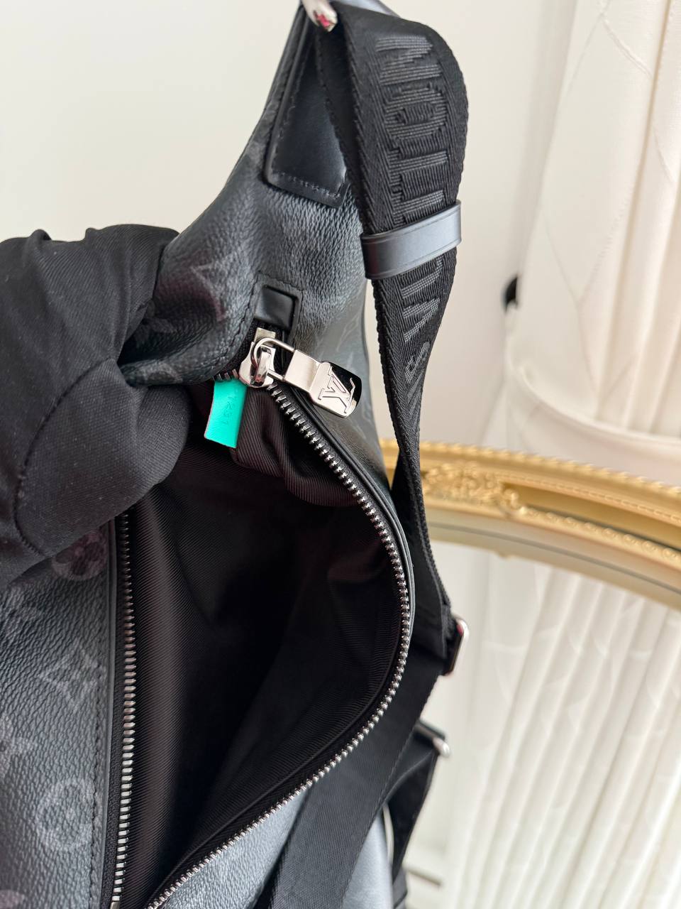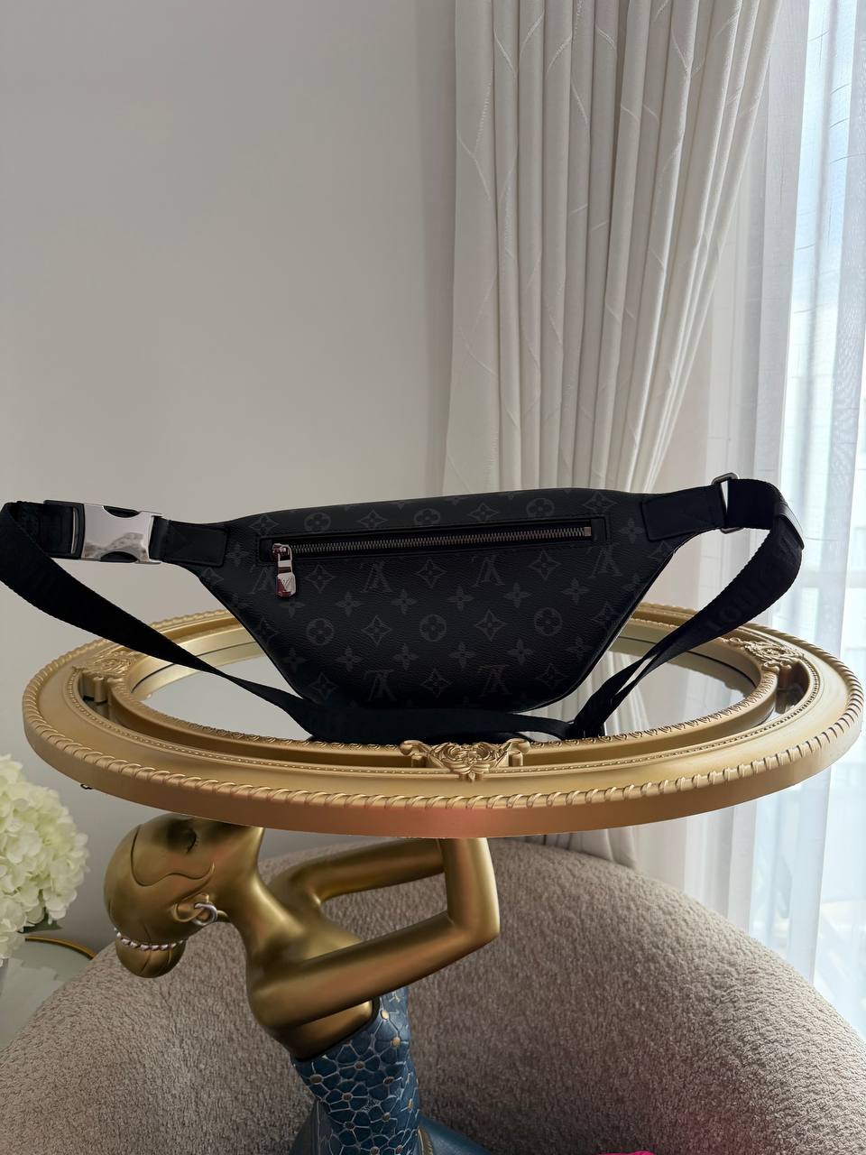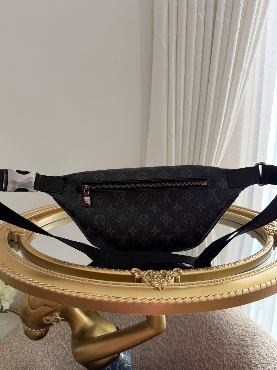 This is a Louis Vuitton Discovery Bumbag PM in Monogram Eclipse canvas with colored leather accents.