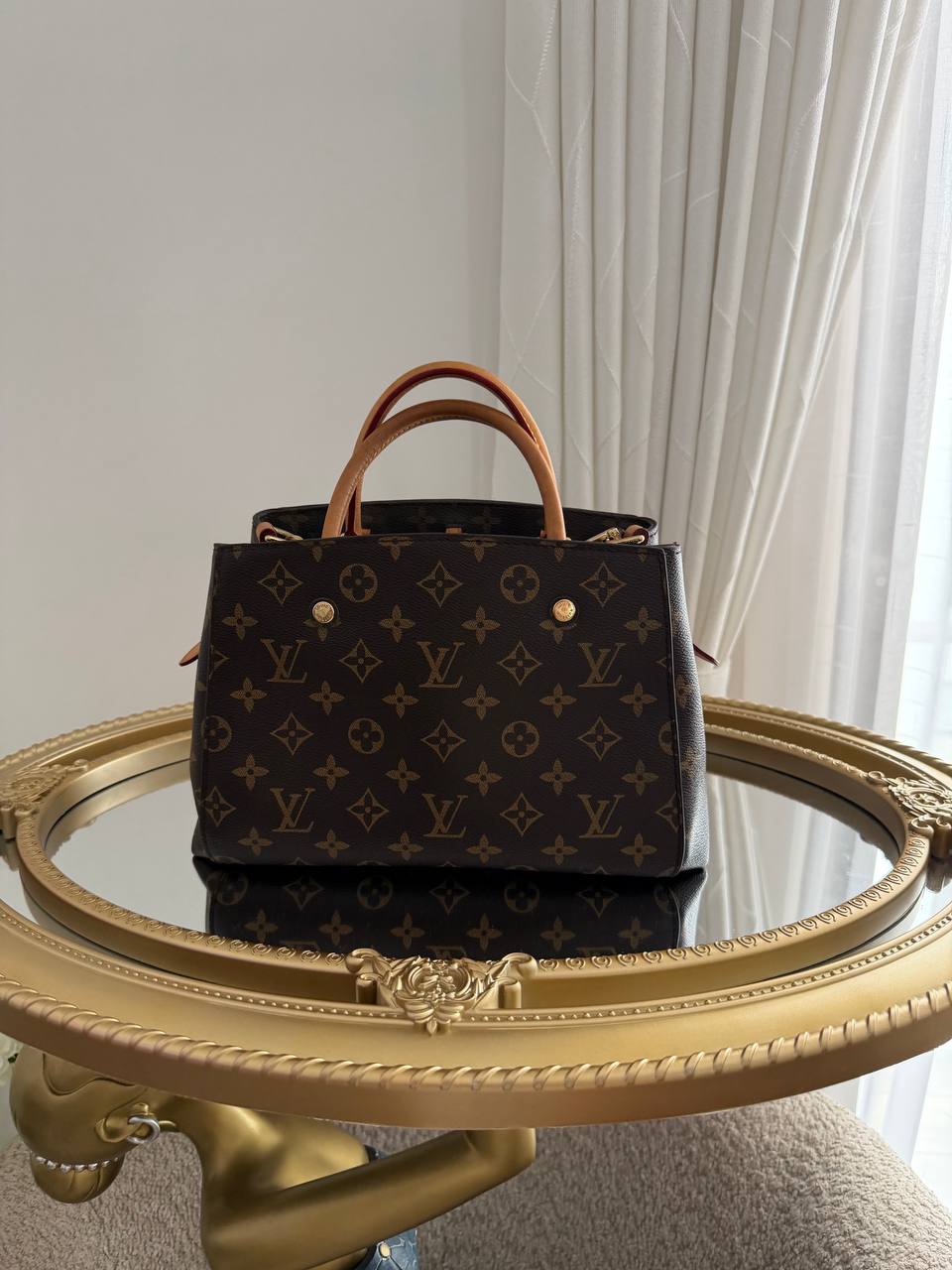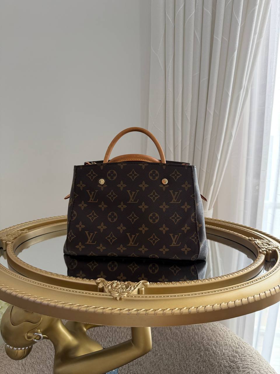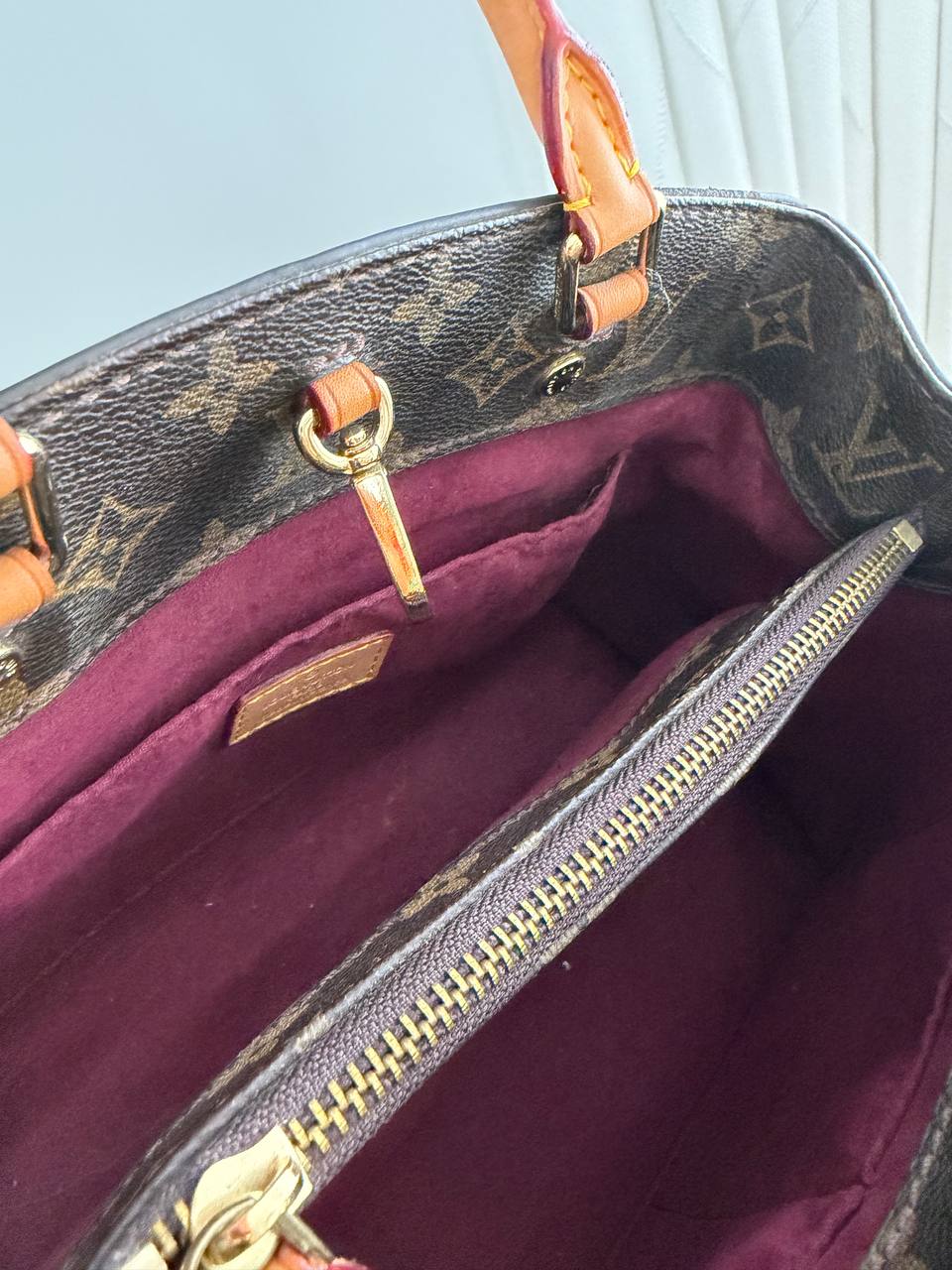 The product shown is a Louis Vuitton Montaigne handbag, designed with the brand’s iconic monogram canvas and featuring structured lines and functional compartments.