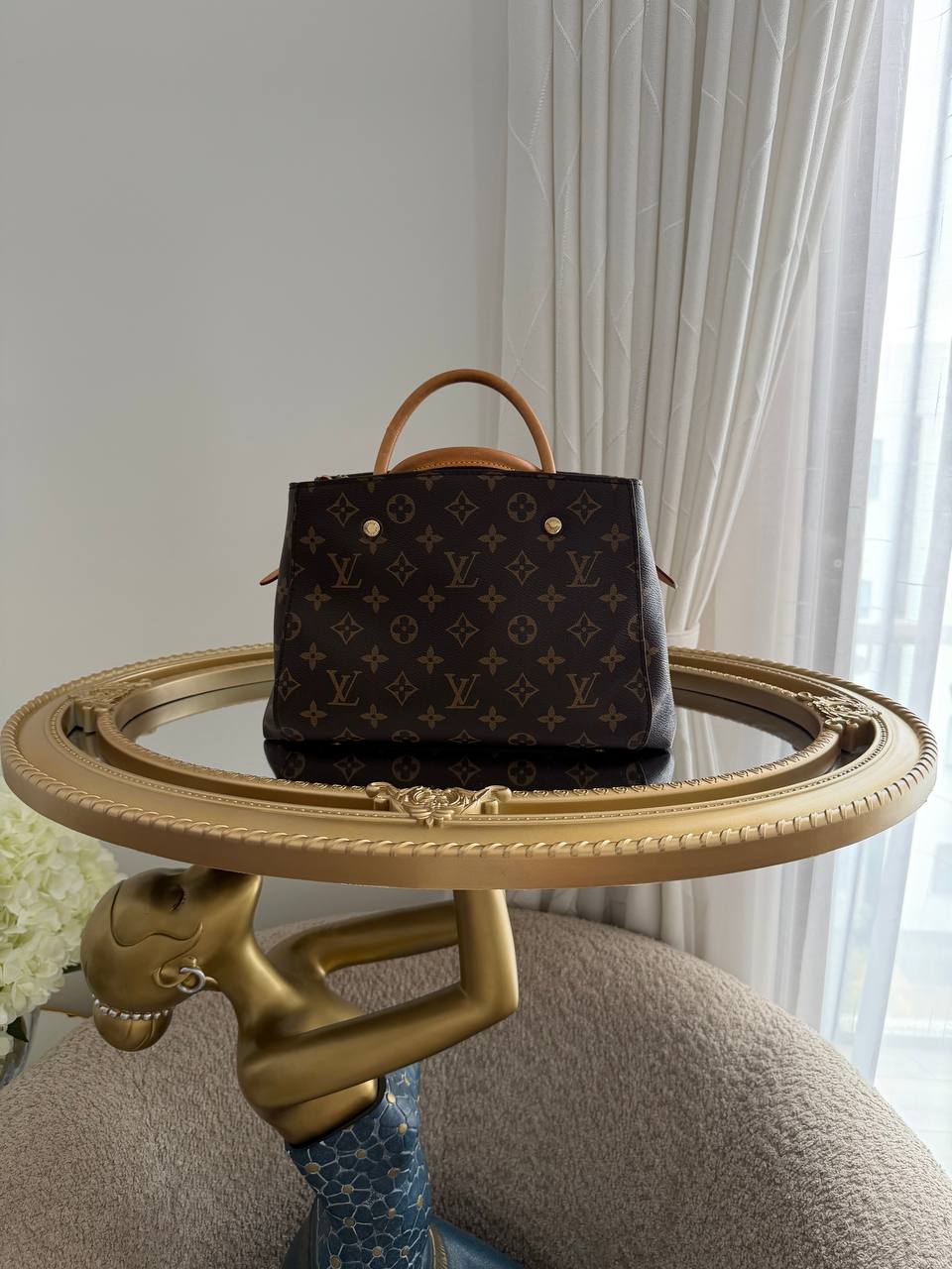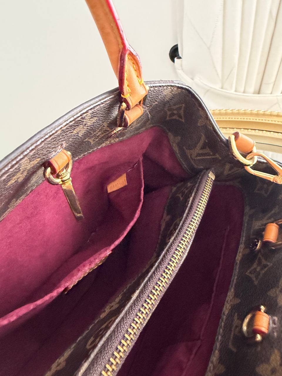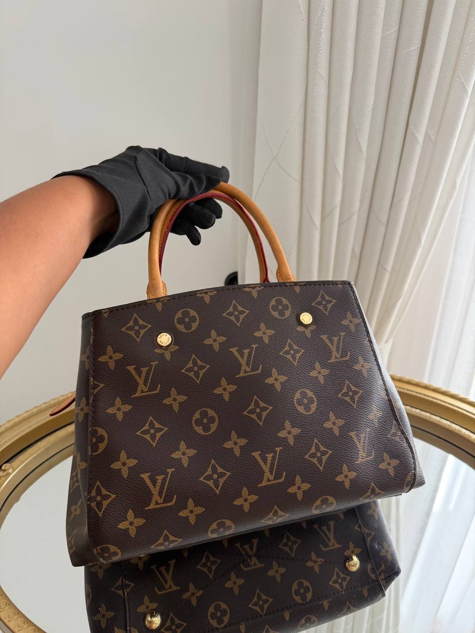 The product shown is a Louis Vuitton Montaigne handbag, designed with the brand’s iconic monogram canvas and featuring structured lines and functional compartments.